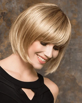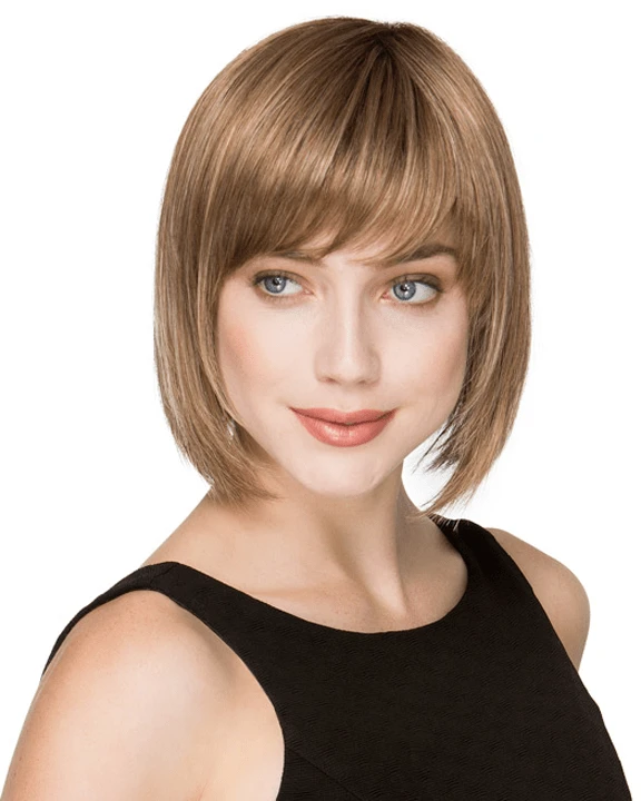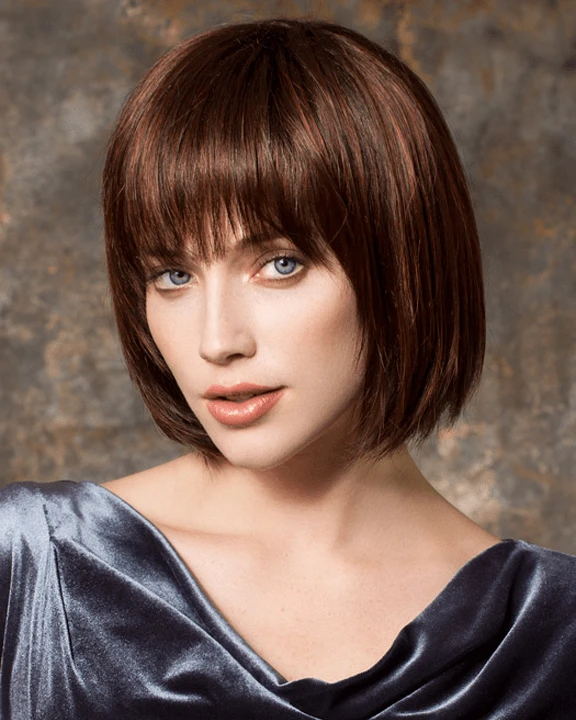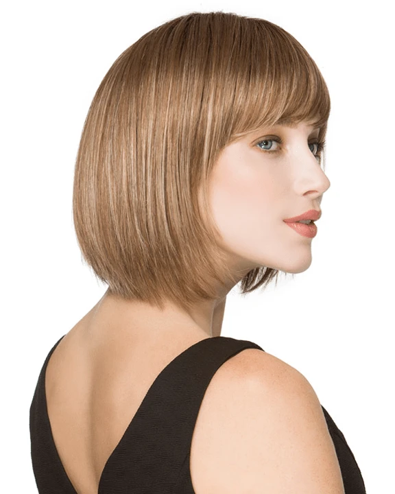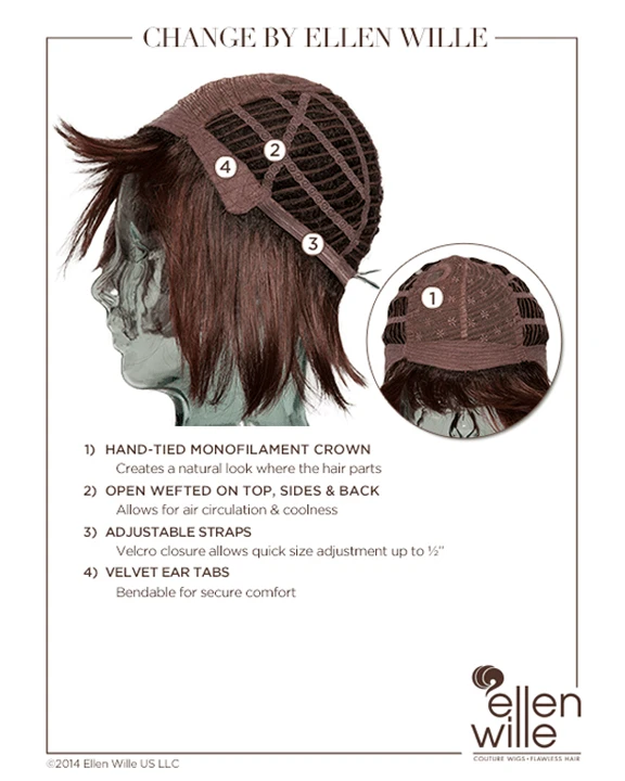 Change by Ellen Wille is a short, trendy, and softly angled cut wig. The hair and bangs are cut to create the classic bob hairstyle. The layers extend below the chin and have fullness at the root to add volume with movement. The monofilament crown is located behind the bang and gives a scalp-like appearance. If needed, the wispy bang can be trimmed to fit your face shape. Change is a part of the Ellen Wille Perucci collection. The monofilament part is placed off-center and is hand-tied and sheer to add a natural touch. The cap is designed with openings throughout the back to allow the air to come through and keep it comfortable all day. The synthetic hair is pre-styled with super straight locks and is ready-to-wear out of the box.
