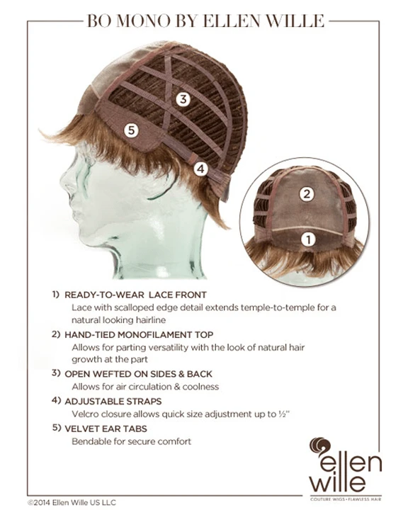 Bo Mono wigs by Ellen Wille is a mono top, lace front wig. Sassy, sporty and graceful.  Pleasantly unobtrusive.