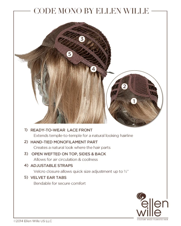 Code Mono by Ellen Wille is a long, layered, and super straight synthetic wig, found exclusively at Wigs.com. The straight layers extend mid-back and have jagged ends to add a natural, flat-ironed look. The lace front is hand-tied and extends into the part for the most natural look. You can have the side bang trimmed by your stylist to frame your face and make it flattering for you. The open wefted sides and back keep the cap feeling comfortable, light, and cool. Code Mono is a part of the Ellen Wille Hair Power collection.