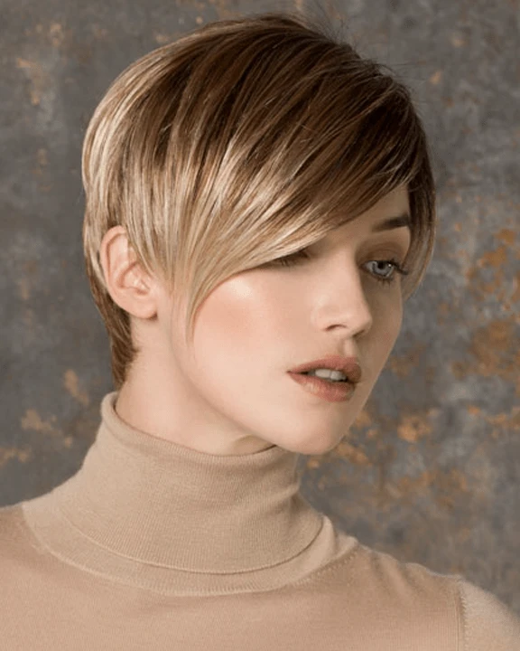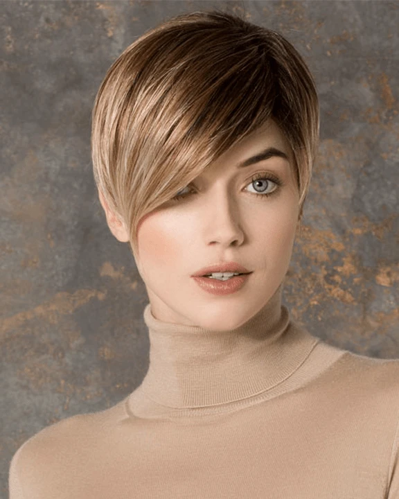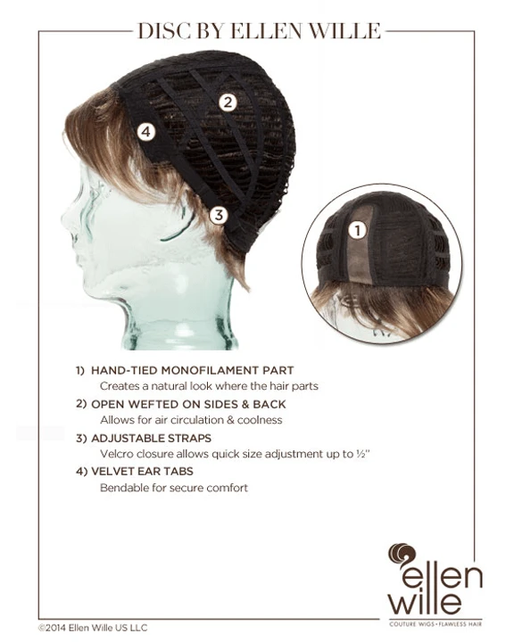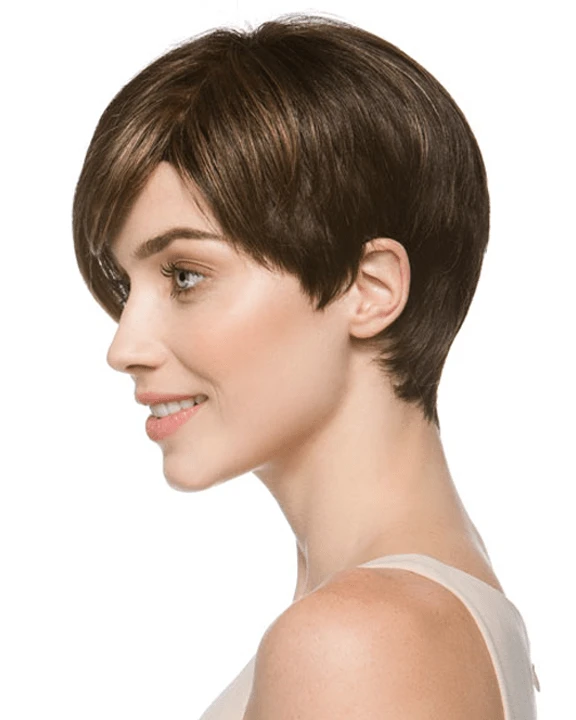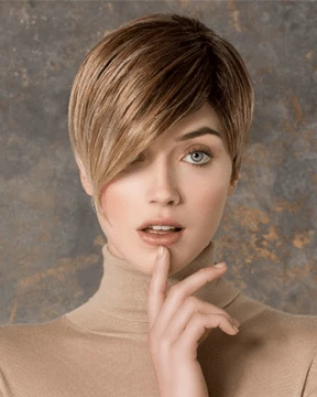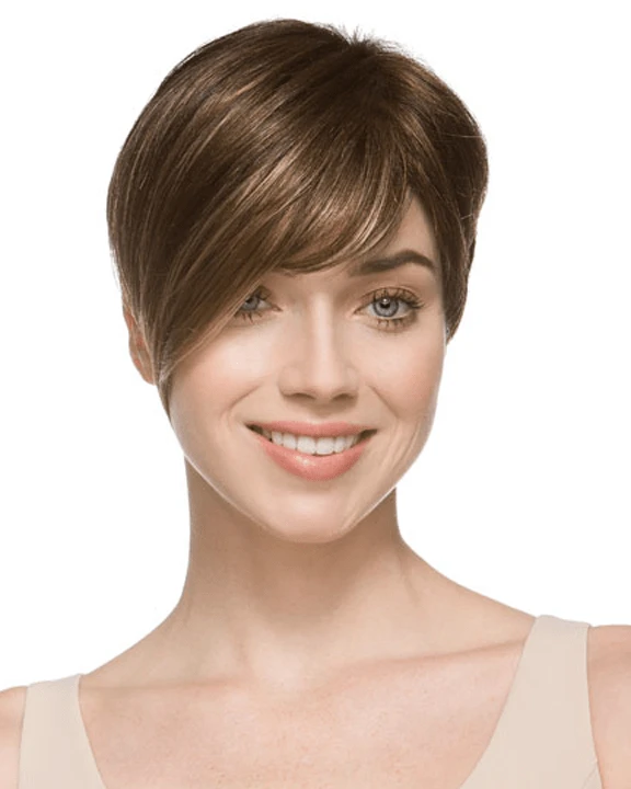 Disc by Ellen Wille is a short, asymmetrical boy cut with a soft, tapered neckline and angled fringe. This modern short wig features a monofilament left-side part, and is ideal for a petite to average head size. The density of the ready-to-wear synthetic hair looks more like natural hair and requires little to no customization or thinning. Disc is part of the Ellen Wille Hair Power collection.