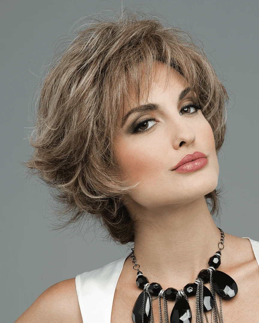 Kylie by Envy features the latest in heat friendly fiber with its unique blend of 30% human hair and 70% synthetic fiber.  Envyhair was developed to give a high tech alternative to human hair products.  The fiber itself allows usage of most heat appliances up to 210 degrees with moisture controlled properties that will allow your style to last all day.  Brush, style and comb with ease. Envyhair behaves naturally while maintaining the fell and texture of human hair.  Kylie is constructed with mono top and hand tied sides and back with a soft chiffon lining for the more sensitive scalp.
