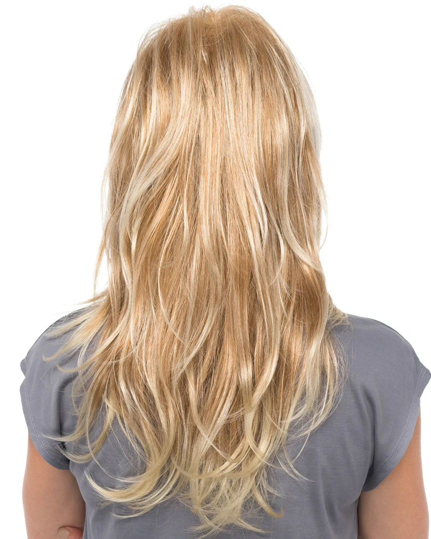 Peace by Estetica Designs is a long feathered cut with slight body wave, framing the face with bangs.