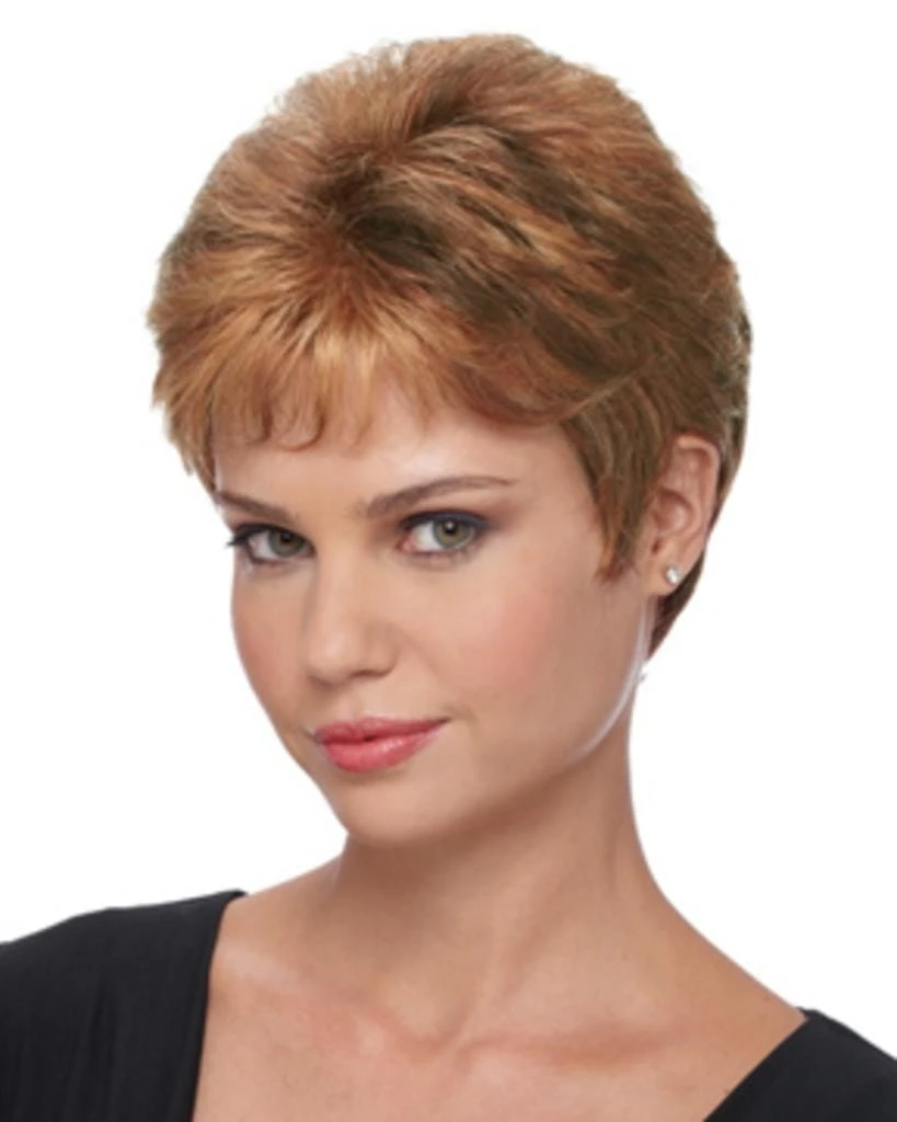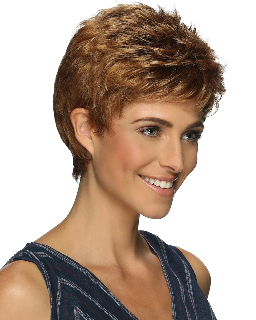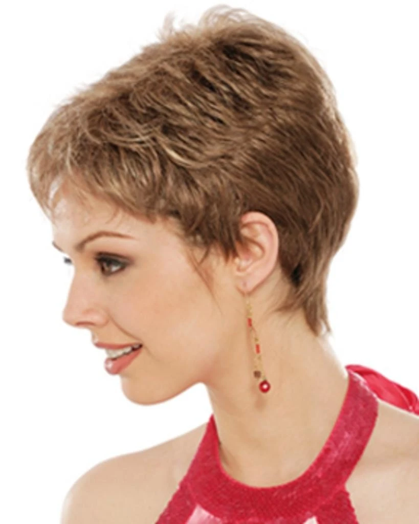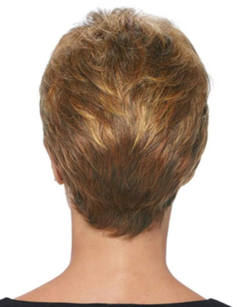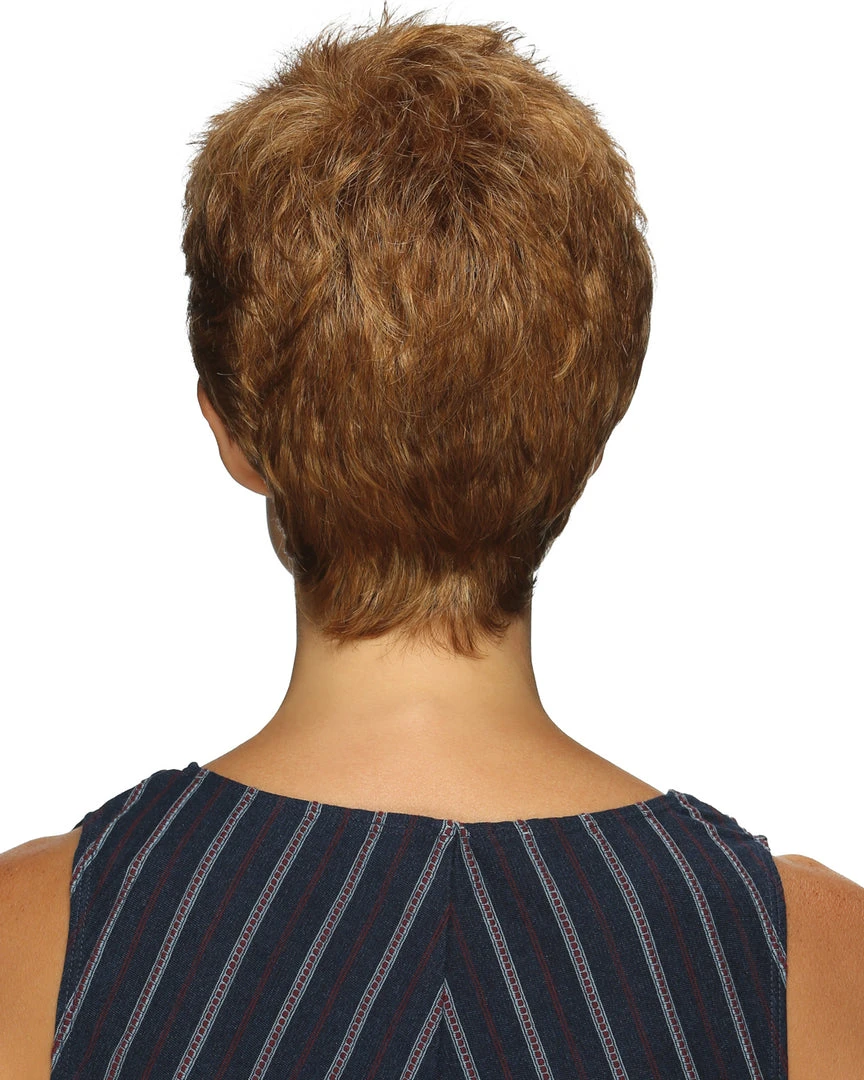 Petite Nancy by Estetica Designs is a short pixie cut with a tapered neckline.
