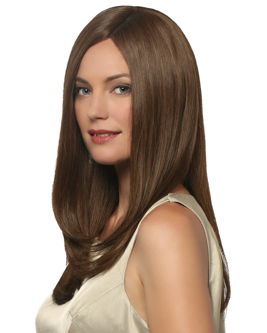 The Treasure wig by Estetica Designs is a french part Mono Top with 100% hand tied back. Simple yet sleek, Treasure is a long, straight, layered style. Her cap features a French part mono top specially constructed with a unique hand-tied interior that eliminates any visible knotting, so you can style her as you wish.