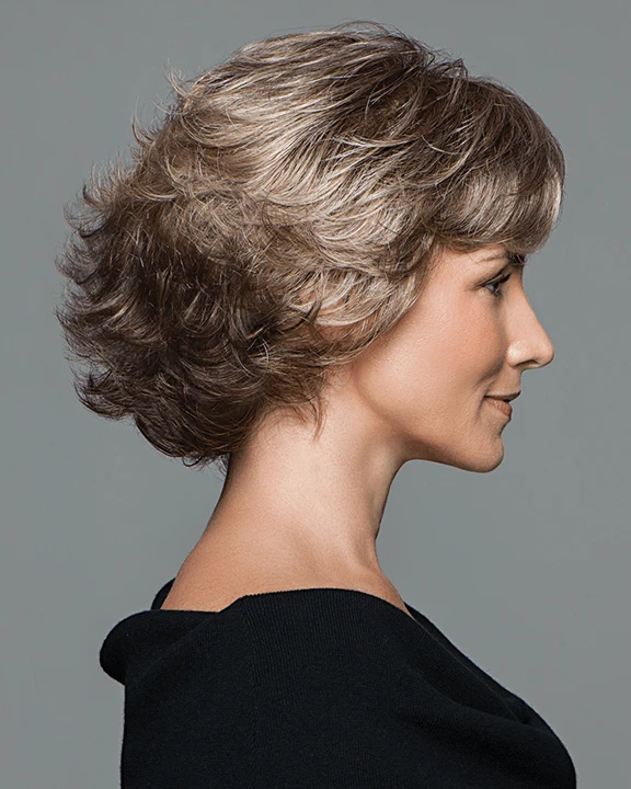 A silhouette of all-over open curled layers, this feminine, face-framing collar-length cut includes a hand tied top for light, cool comfort and a sheer scalloped hairline for off the face styling.