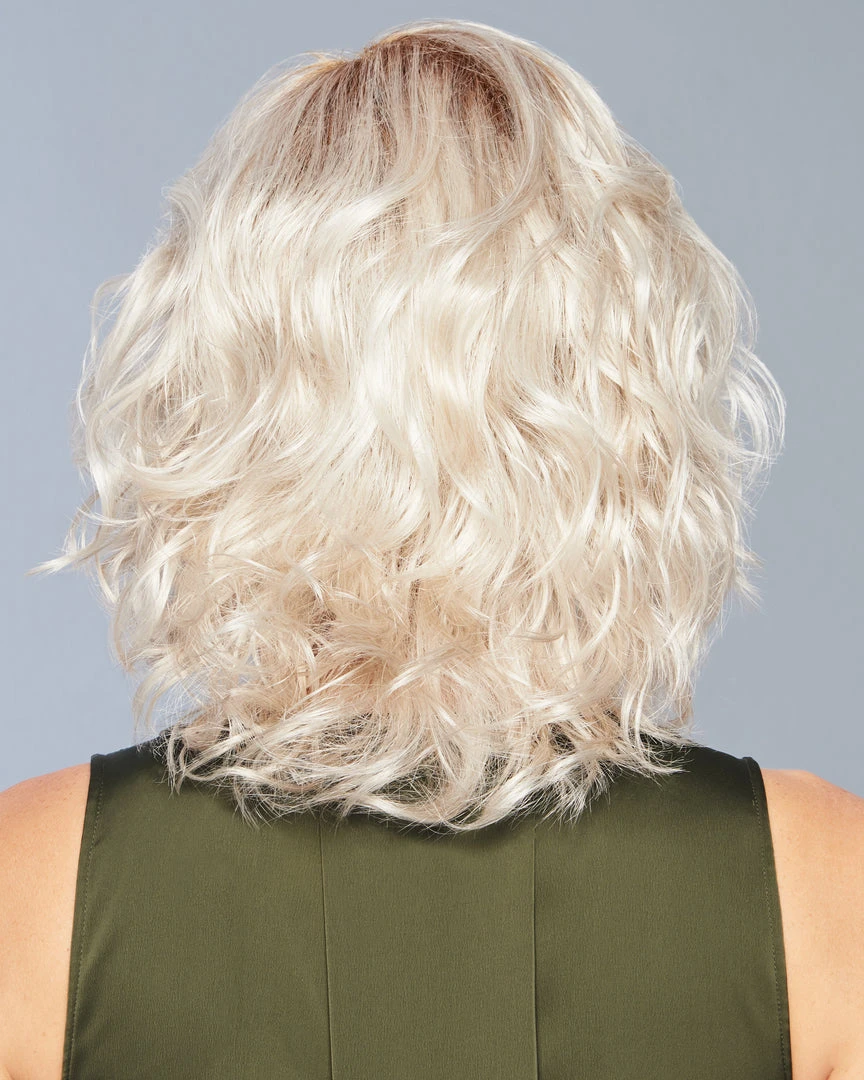 A collar length, all over layered shape with tons of spiral waved curls that can be scrunched for more fullness or gently brushed into soft waves. The eyelash bang adds a subtle frame to emphasize the eyes and the temple-to-temple lace front allows for off-the-face styling.