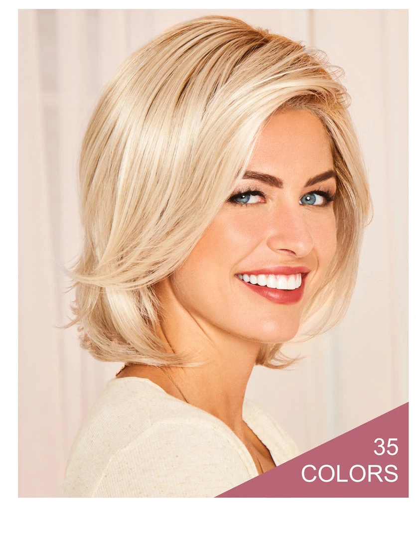 Flatter Me wig by Eva Gabor. From the smooth lengths and the 100% hand-tied top, to the professionally textured layers that feather around the sides and back, the look is fresh and free-flowing. Temple-to-temple sheer lace along the front hairline allows the subtle bang to be worn forward or off the face.