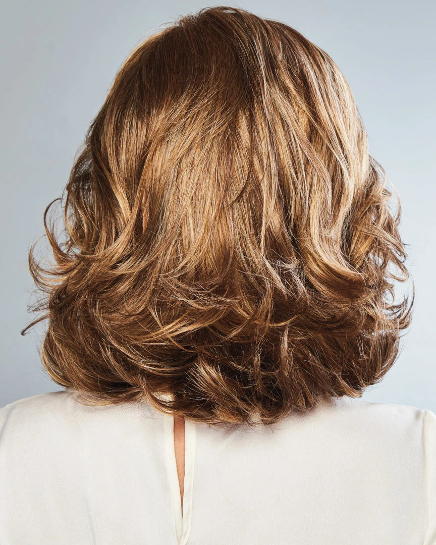 Voluminous barrel waved layers give this style soft, gentle fullness throughout. A deep monofilament part provides natural density on top and adds some spice to the sweet.