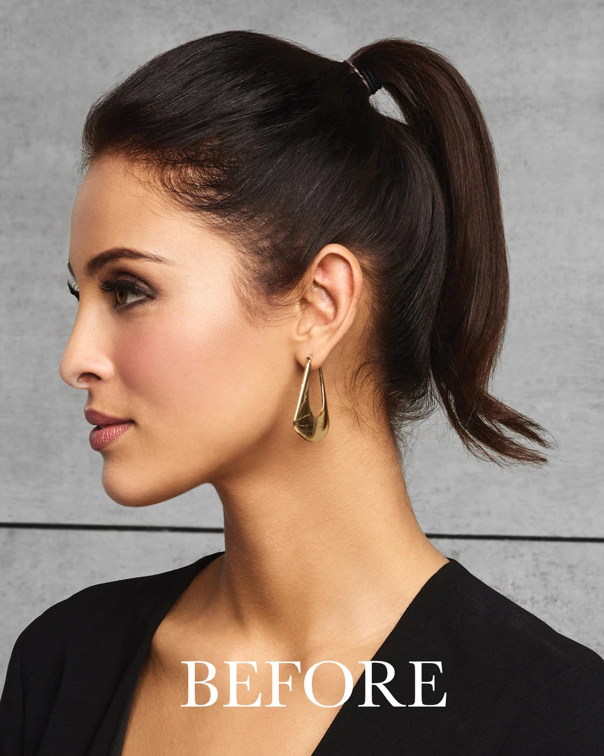 12″ Simply Straight Pony by HairDo. No pro? No problem! Your ponytail just got an instant makeover with this do-it-yourself style. Change the texture using a curling iron or flat iron. Braid or style in an updo. This hairpiece features a strip of hair that wraps around the holder and fastens it in with a hook-and-loop strip to conceal where the ponytail meets your own hair.