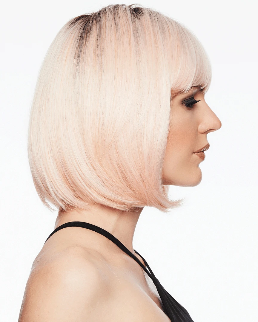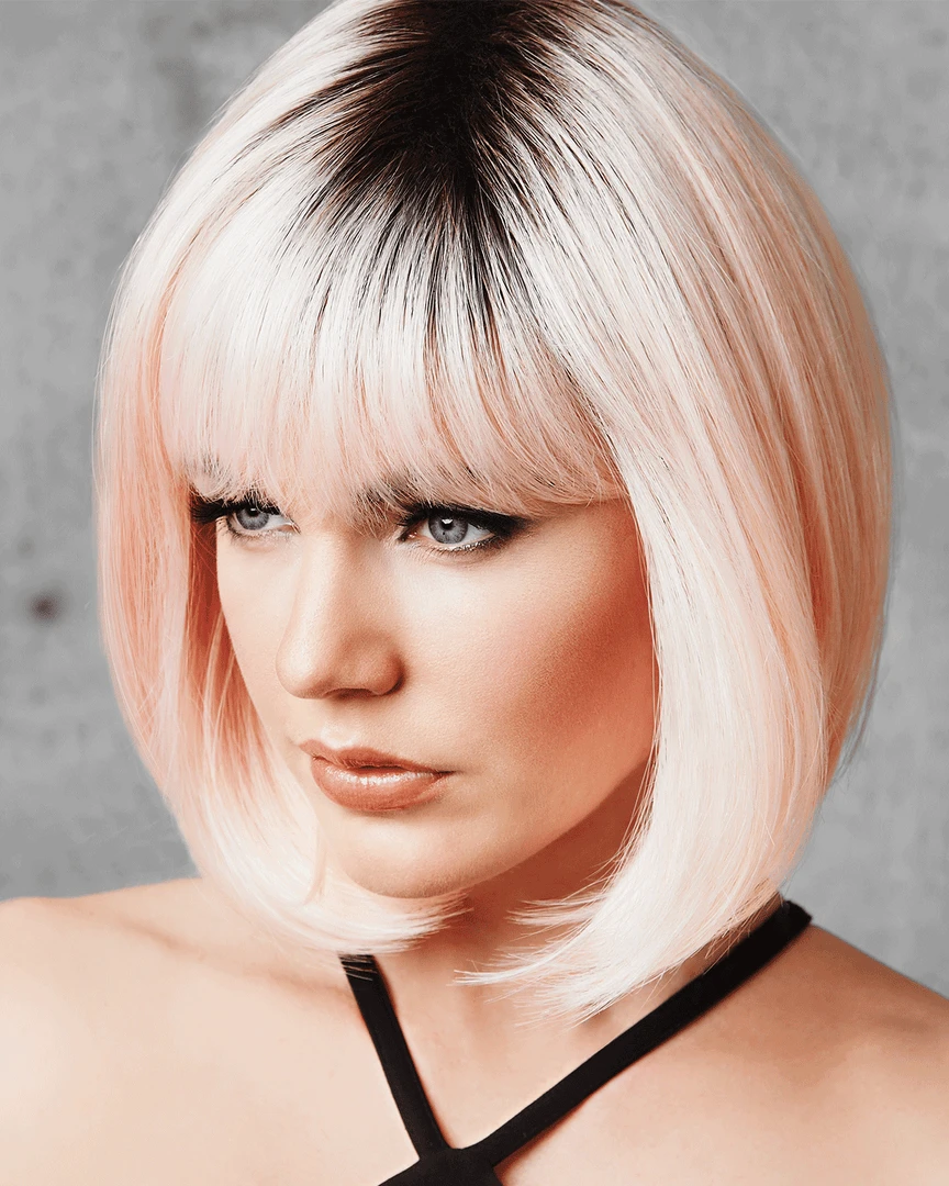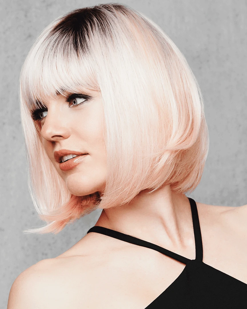 Peachy Keen by HairDo. The perfect shade of peachy pink can now be yours without commitment. This pastel color trend is paired with a bob cut, making it classic yet edgy. The multi-faceted color has a darker root to add contrast and a natural look. Have your hairstylist customize the bang and style the Tru2Life® heat-friendly synthetic hair with a curling iron or flat iron. The cap is made to be light and as cool as you.