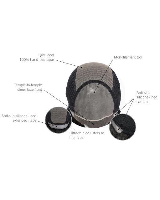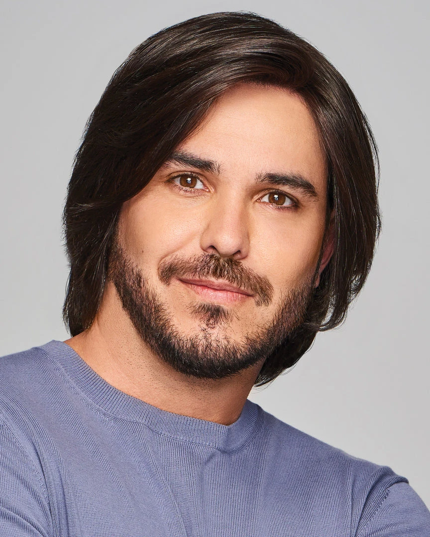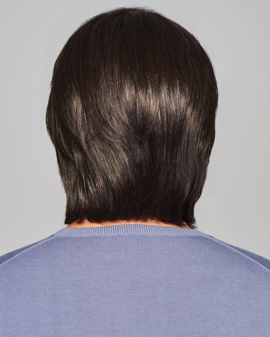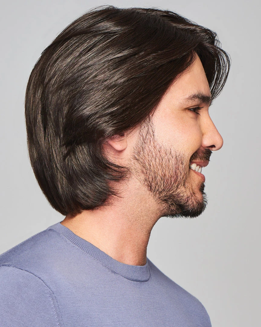 The Sharp men’s wig by HIM has added length designed to be professionally cut and customized to suit your style. Try a texturized “surfer” cut or a more “rocker” look with razor-cut layers. The artfully crafted lace front looks just like the hairline you had, while the hand-tied monofilament top allows for a multitude of parting placements. The soft, wefted cap provides a light, cool feel that’s natural and versatile.