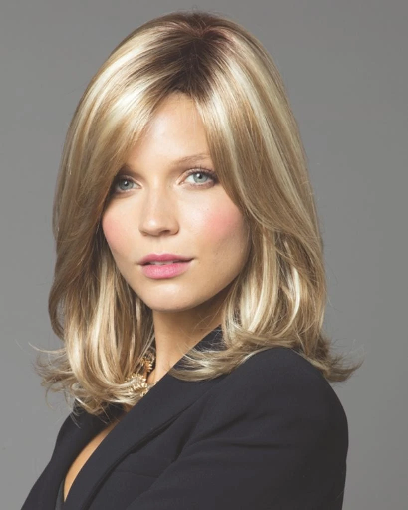 Kenzie by Noriko is a voluminous and layered synthetic wig with a full side bang. This mid-length style has fullness at the crown and movement throughout. To further personalize, have your stylist thin the side bang or add a full bang.Â