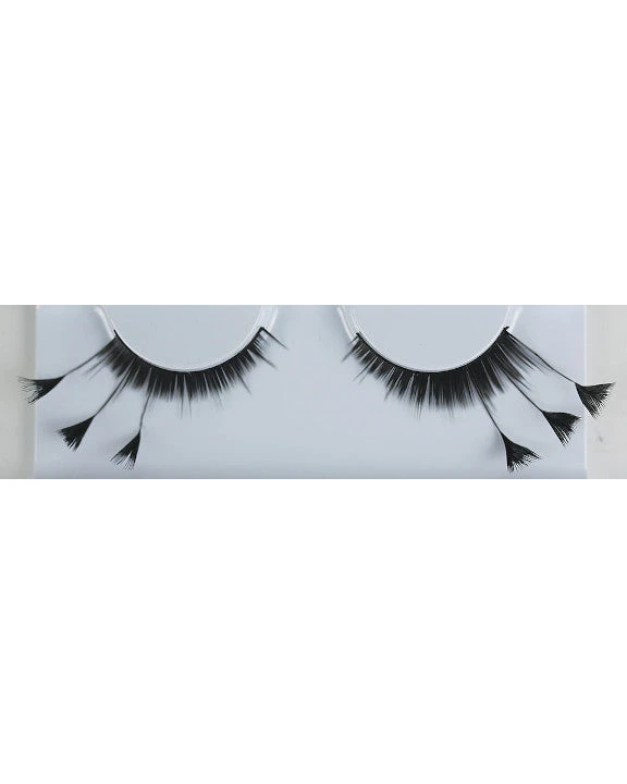 Priced per pair. Add some dramatic flair with these beautiful Black Feather Fantasy Flare Eyelashes! These unique Halloween eyelashes are a combination of a regular eyelash with three long feather flare strands at the outside edge. Great look for a Sultry Witch, a Dark Fairy, a Sexy Sorceress, or a beautiful Showgirl! Apply with regular eyelash glue.