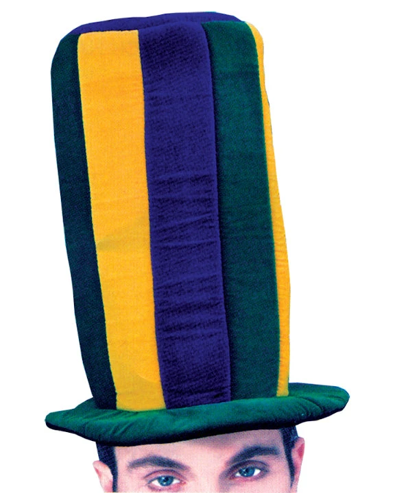 Perfect for Mardi Gras parties and whenever a colorful hat is needed. Super tall striped felt hat. Multicolor hat: yellow, green, and purple. Hat stands 16 inches tall.