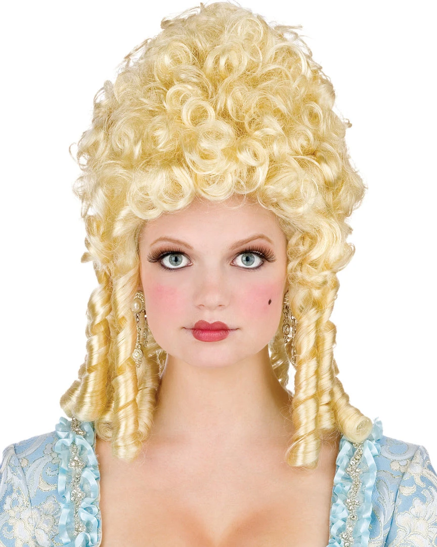 Saucy Marie Heads will roll! Marie Antoinette style wig with long side curls and high fluffy curl top.