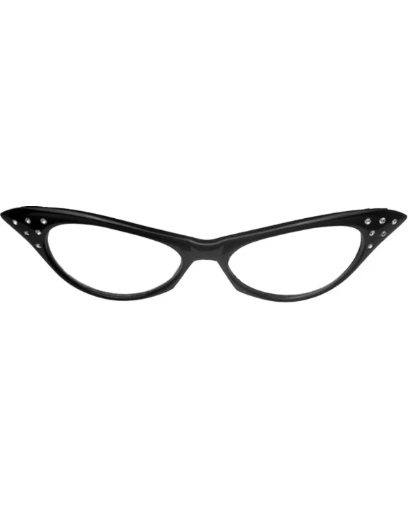 Classic 50’s cat eye shaped black frame glasses with rhinestone accents. Metal hinges and plastic frames with clear lenses. One size fits ages 12 and up.