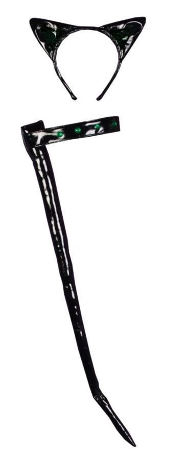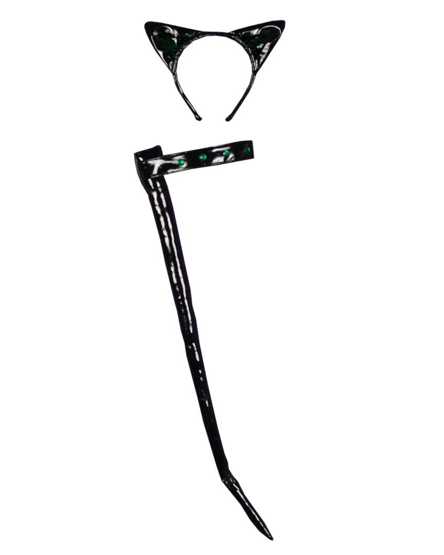 Cat Set Black Leather Like. Matching leather-like headband, choker, and tail. Plastic gemstone accents. Just add your own tights and leotard and you have an instant costume.