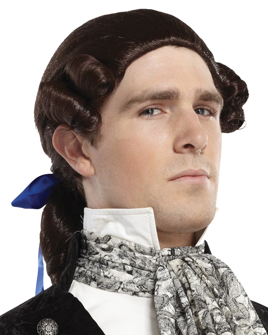 Colonial Ponytail Bow. Historic 1800’s powdered style wig with curled sides and ponytail with bow.