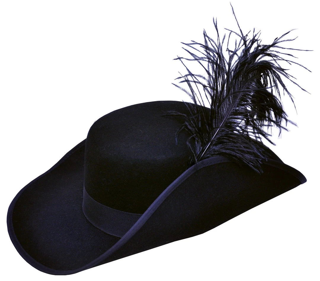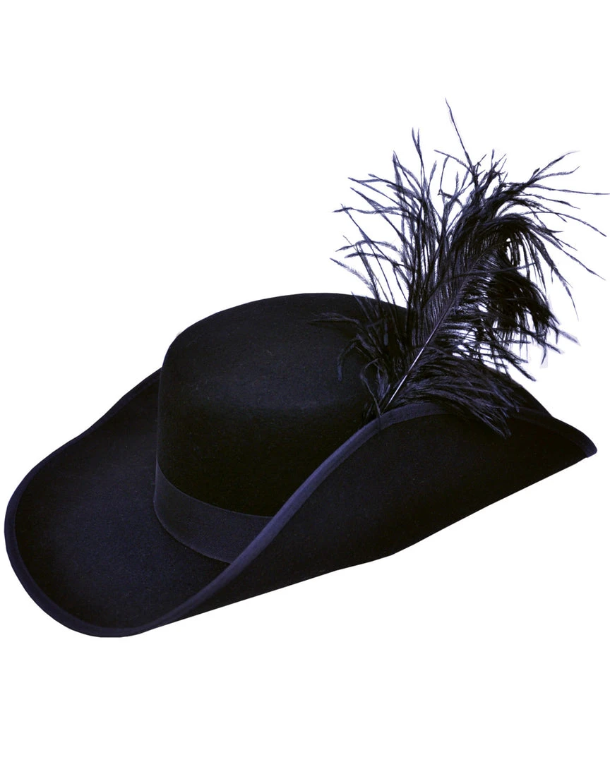 Cavalier Hat Quality. Deluxe heavy black felt with large plume. Brim 4 inches, height 4 1/2 inches.