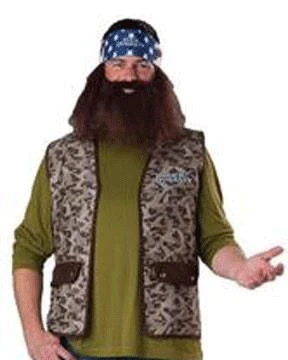 Wig, beard, bandana, and Duck Dynasty camo vest. Add your own shirt and jeans to complete the look. For adults or teens. One size vest fits most small to 3x. Tie in the back of vest allows for multiple sizing.