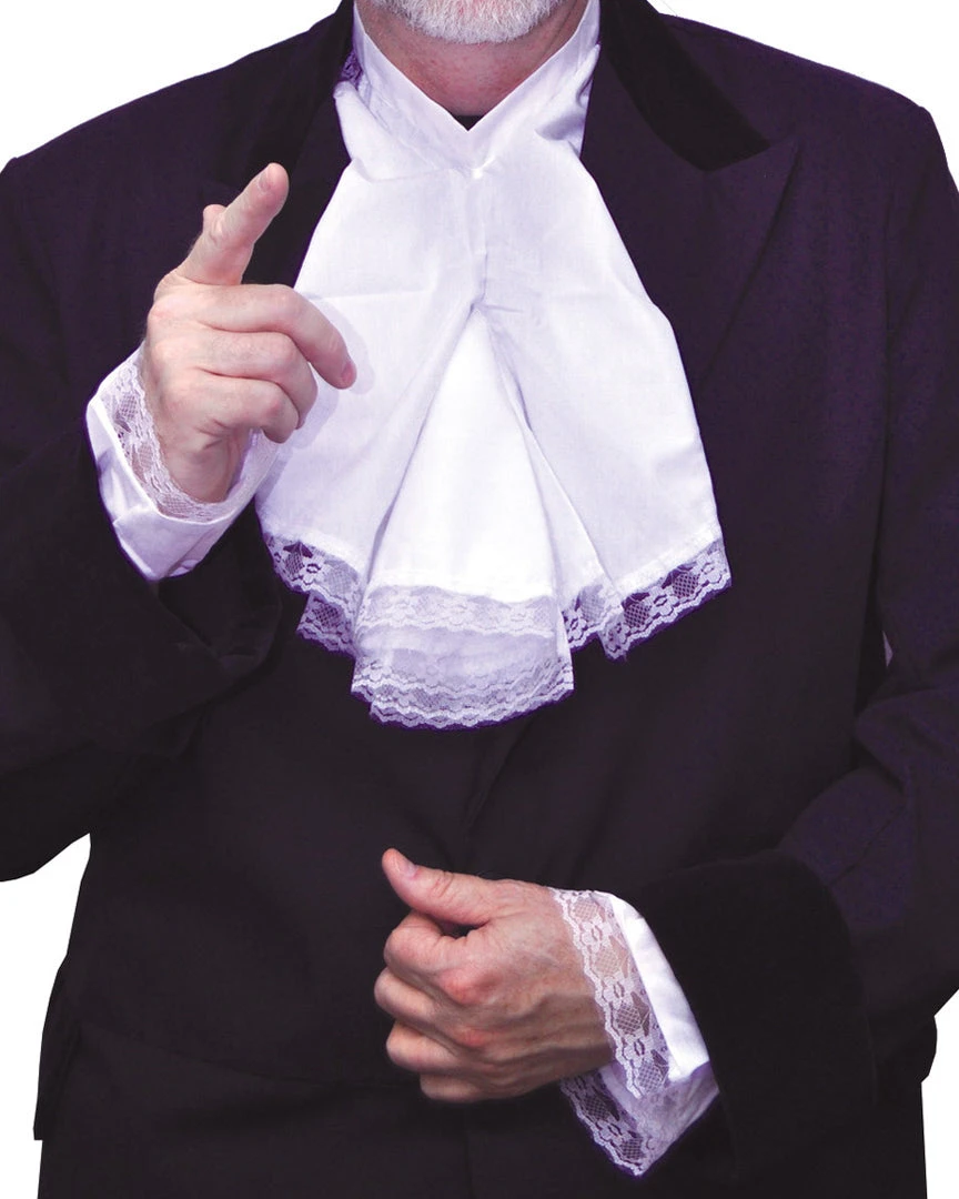 Jabot And Cuffs Colonial. White polyester ruffle jabot and cuffs with lace trim. One size fits most adults.