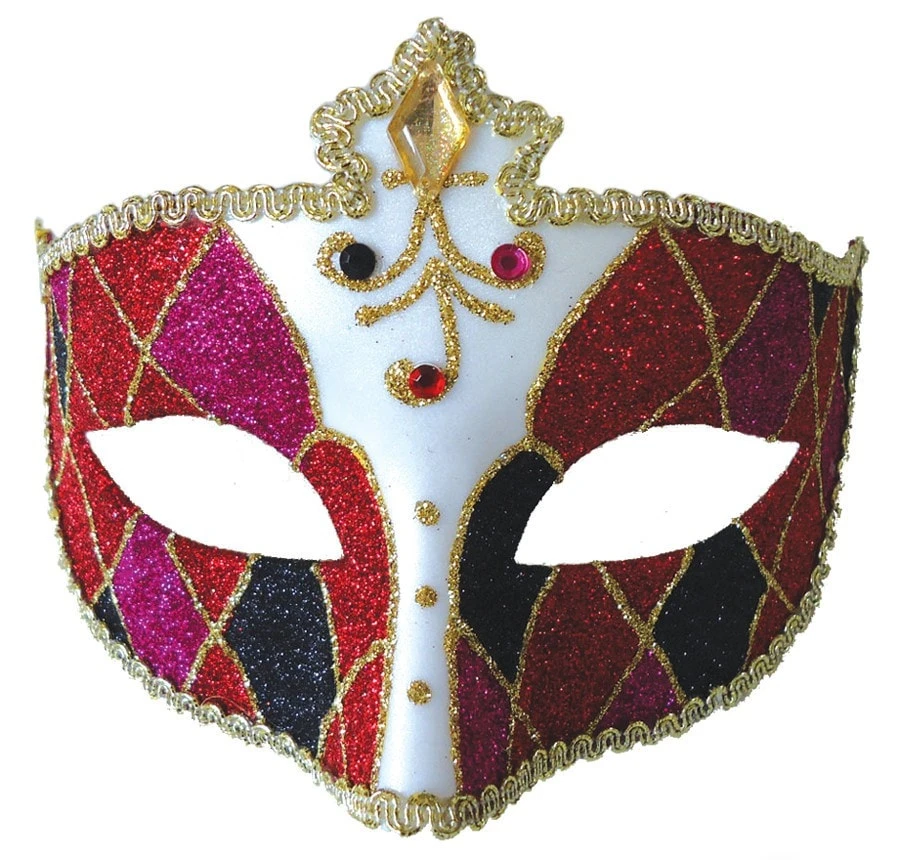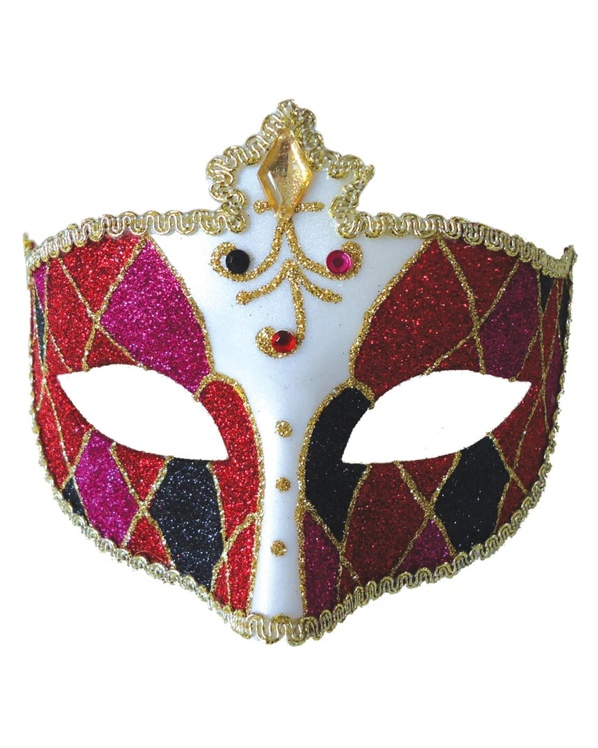 White masquerade mask with glitter detail for the ultimate mardi gras look.