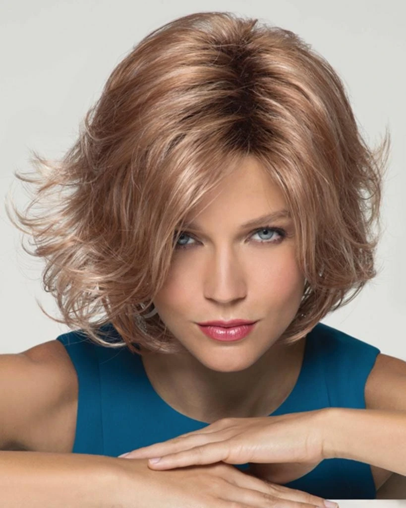 Dolce by Noriko. Softly graduated chin-length bob with voluminous wavy layers and face framing fringe.