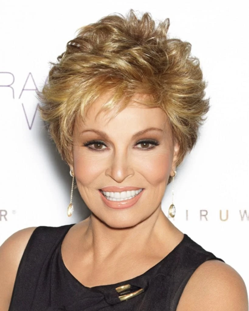 Center Stage by Raquel Welch. Â Under two ounces in weight, this short basic cut offers softly curled all-over layers that blend into an extended nape. Â Plus it has the luxury of a Sheer Indulgenceâ„¢lace front monofilament top and 100% hand-tied base for the ultimate in styling options.