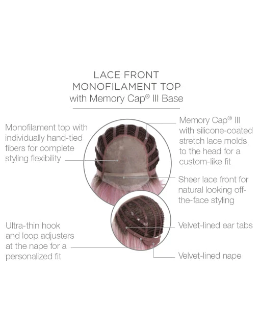 A feminine softly layered bob, Dare To Be includes tapered lengths throughout that gently fall to just below the chin, and lightly textured, side sweeping fringe that perfectly accents the eyes. The sheer lace front and monofilament top allows for off-the-face styling and varied parting options, while the dusty pink coloration reflects the latest trend in fashion hair colors.