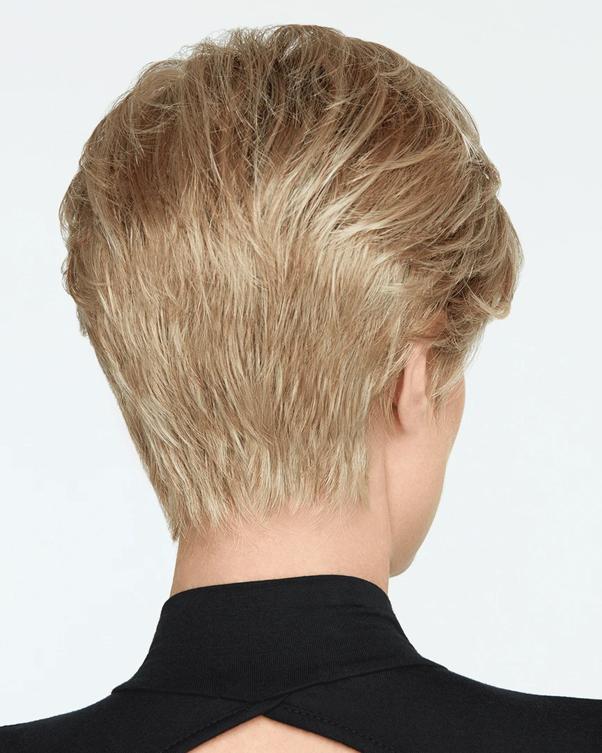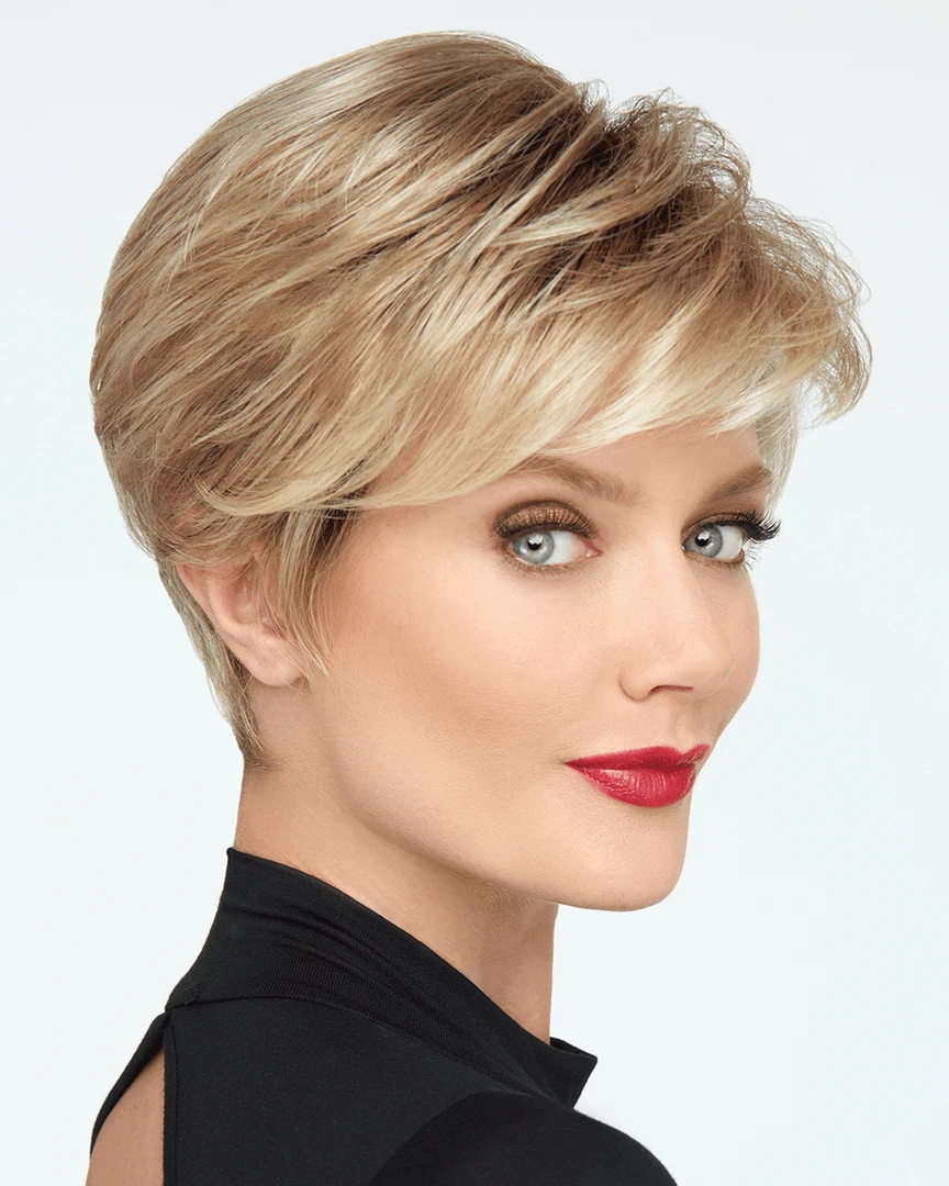 Go For It by Raquel Welch. The classic “boy” cut gets a complete overhaul with the addition of longer layered areas at the front and sides for more styling options. Thanks to the Sheer Indulgence™ temple-to-temple lace front, the piecey front lengths can be styled off- the- face. The longer, textured sides can be worn swept forward for a voluminous look or gently finger-styled behind the ears for a more streamlined effect. A gently sculpted and textured nape adds to the sophisticated look of this style.