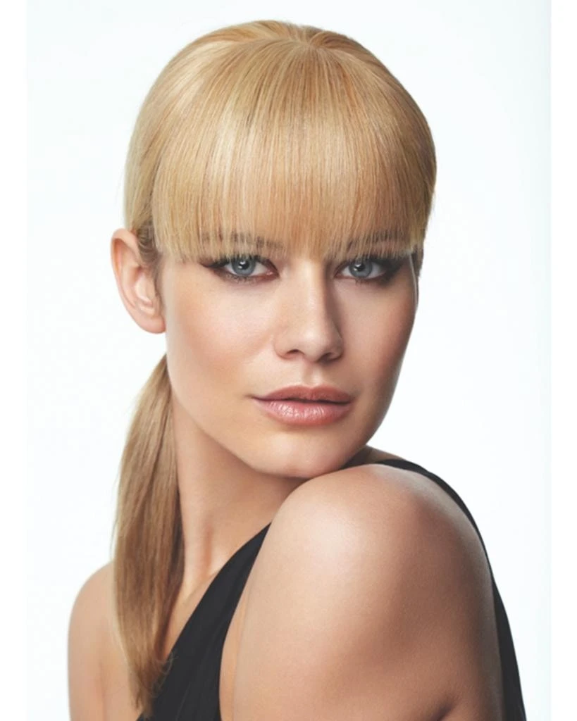 Human Hair Bang by Raquel Welch is face framing bang that consists of 7″ long hair on a 5¼” long by 2¾” wide monofilament base, plus two pressure sensitive clips for a secure fit. The monofilament base allows for varied parting options. Reflecting the latest trend in hair fashion, this versatile piece makes it easy for any woman to have a customized fashion bang without committing to cut her own hair.Â