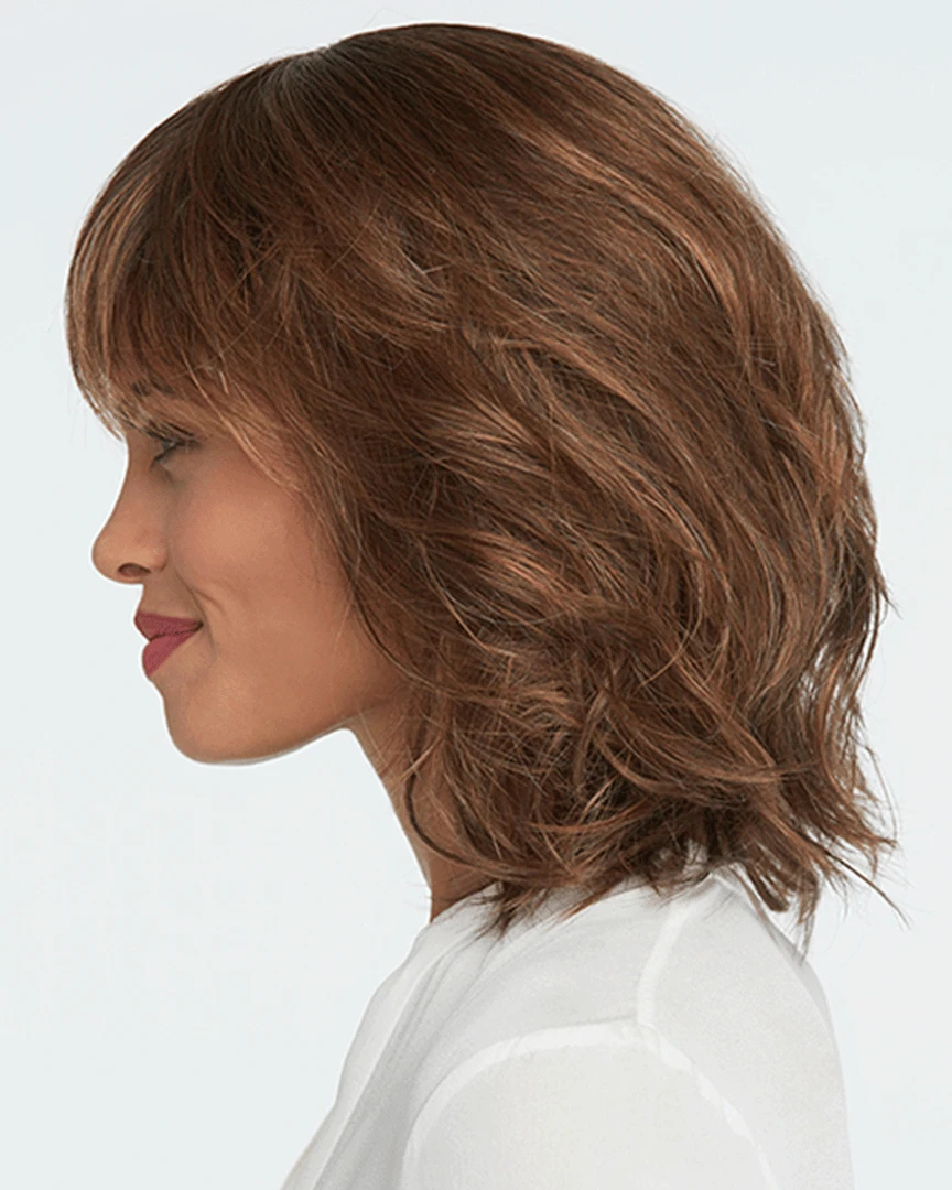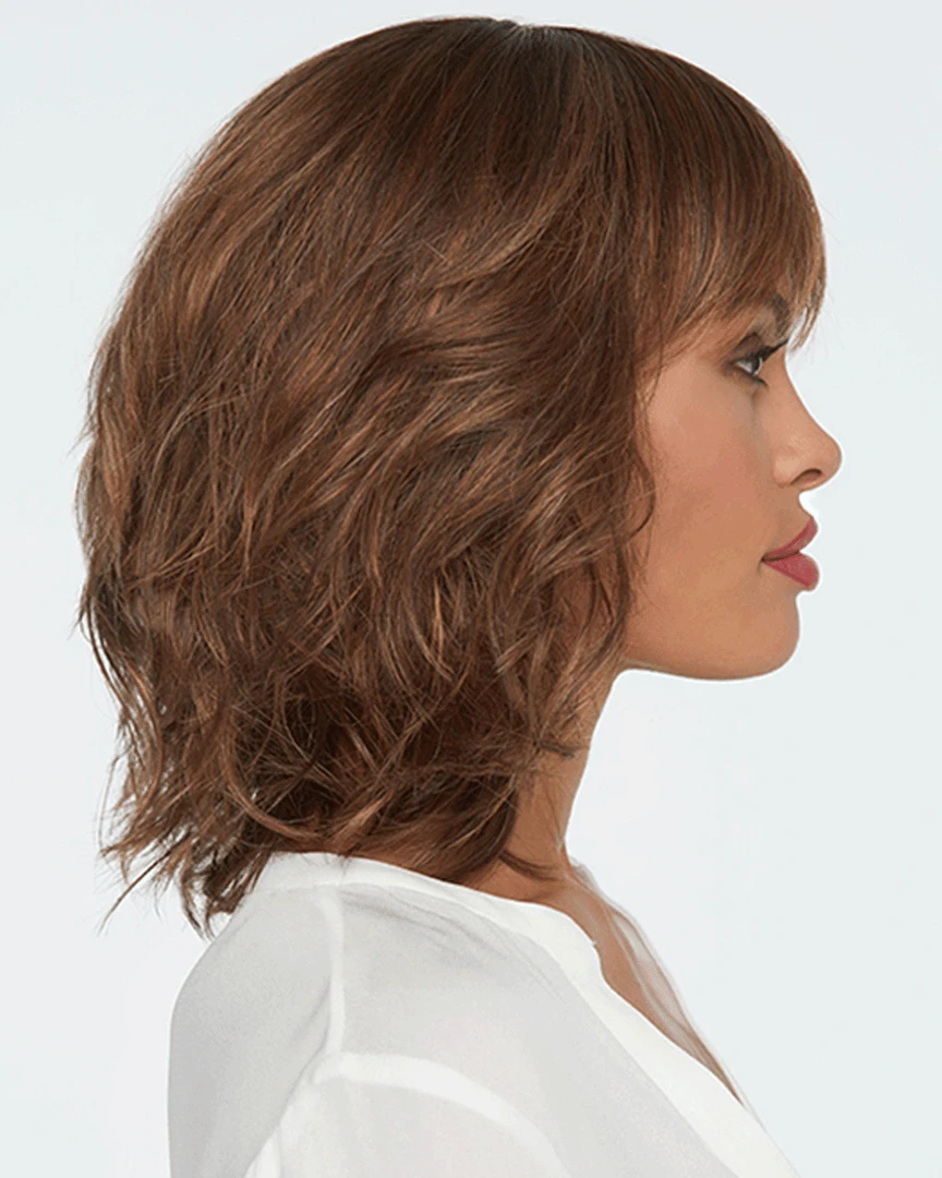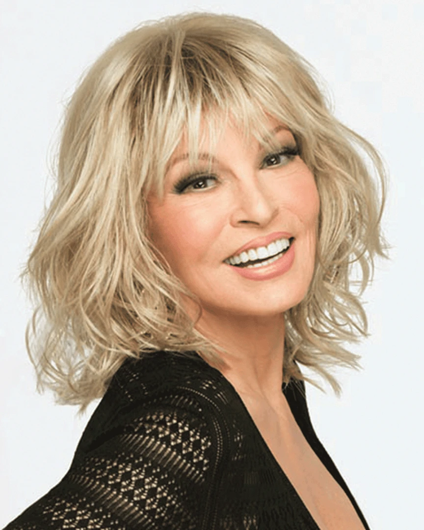 Stop Traffic by Raquel Welch. Texture and movement are the inspiration for this blunt, to-the-shoulder bob. A soft, razor cut fringe frames the eyes while tousled and loose curls are layered throughout for natural volume and an unconstructed look. The Sheer Indulgence monofilament crown provides a natural contour.