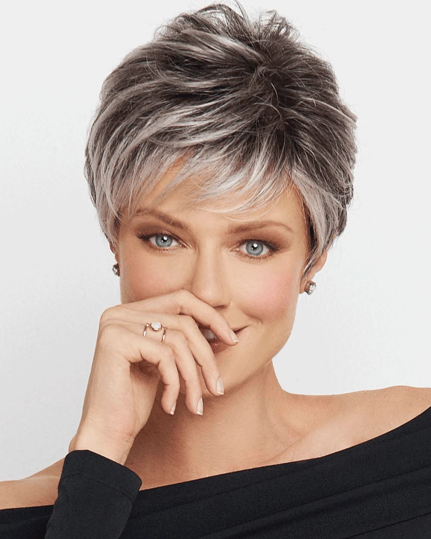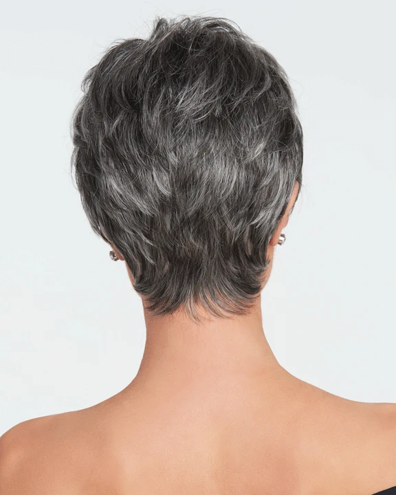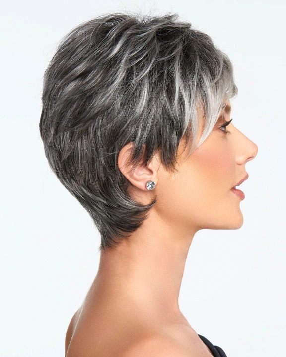 Crushing on Casual by Raquel Welch. This short, boy cut is long on style and fullness. Beautifully tapered lengths throughout offer a multitude of styling options from full and soft to textured and piece-y. The slightly angled fringe can be worn onto the face or swept away while the razor cut nape creates a soft clean look in the back. The Sheer Indulgence temple-to-temple lace front monofilament top allows for natural looking off-the-face styling and parting options.