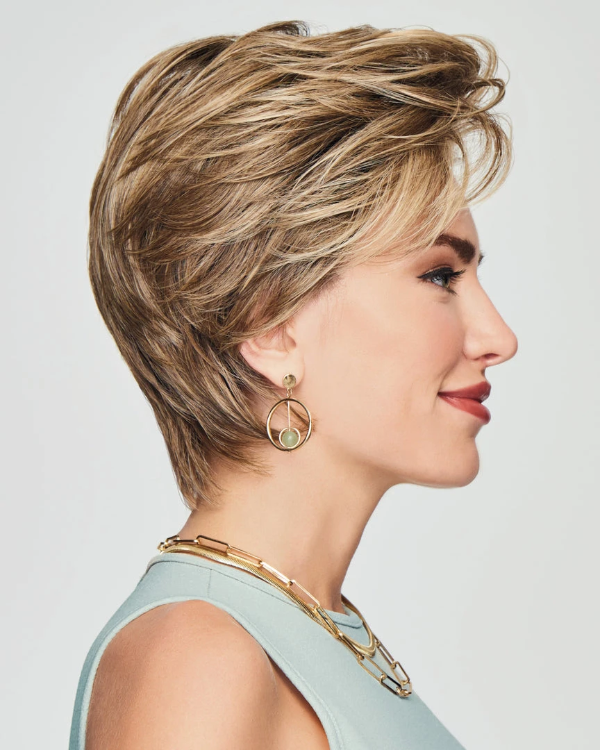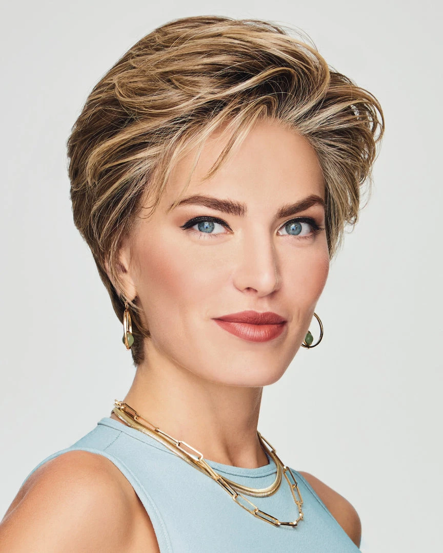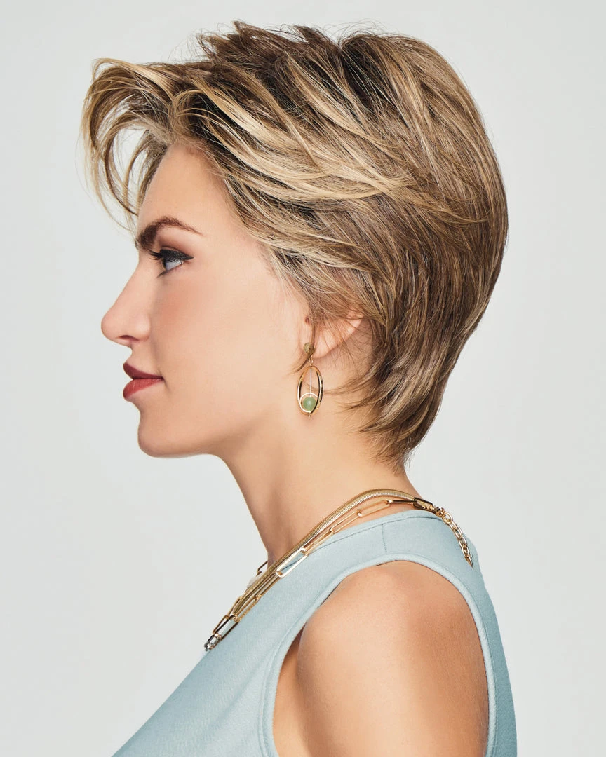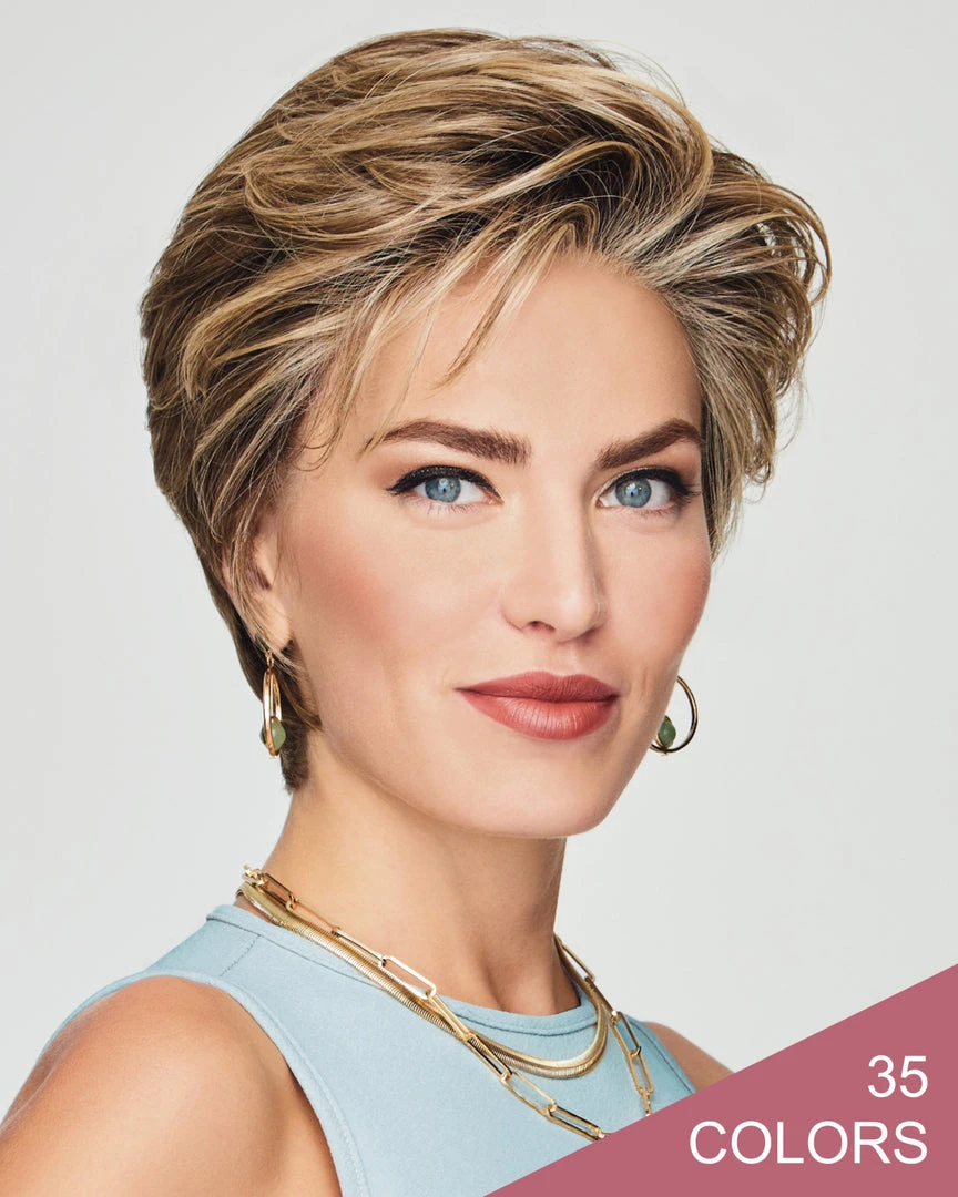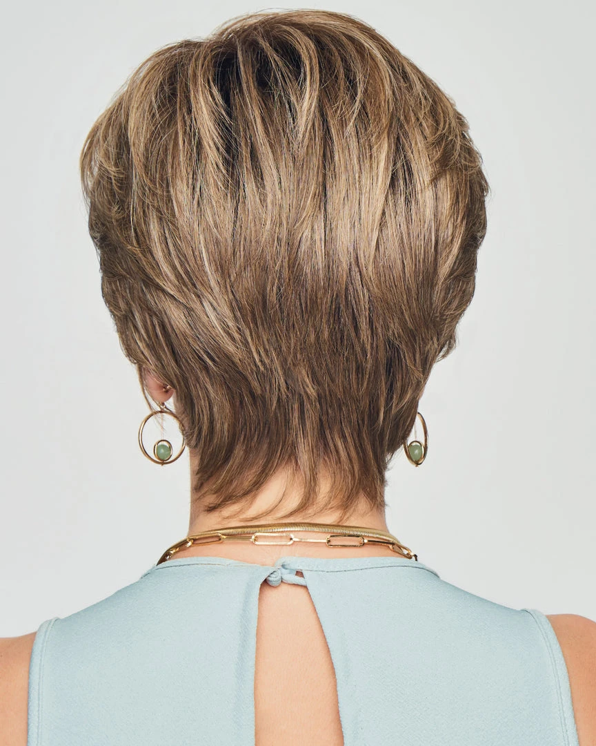 Every detail is in place and perfected from the light, feathery textured bang, to the textured back that sits close to the nape. Gentle waves flow throughout this short, cropped style. Longer layers in the front can be tucked behind the ear. The look is classic and confident.