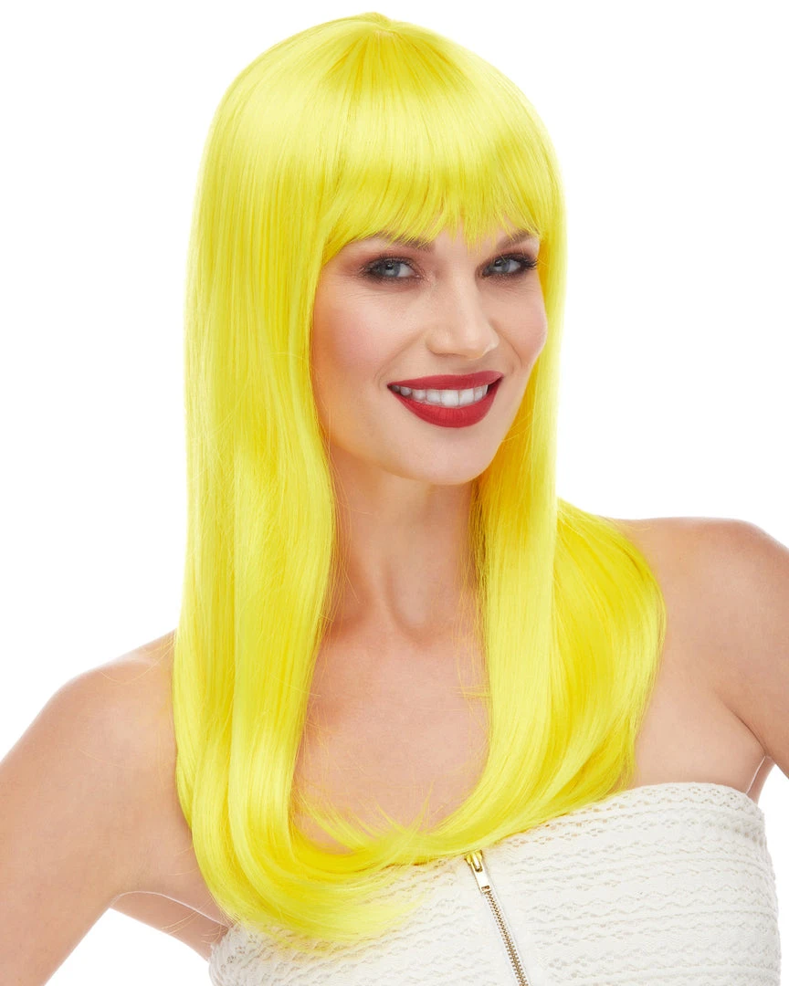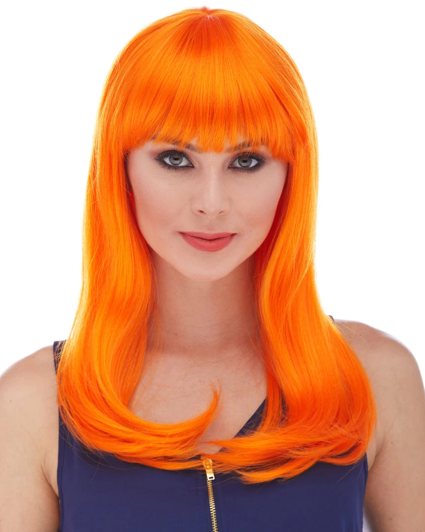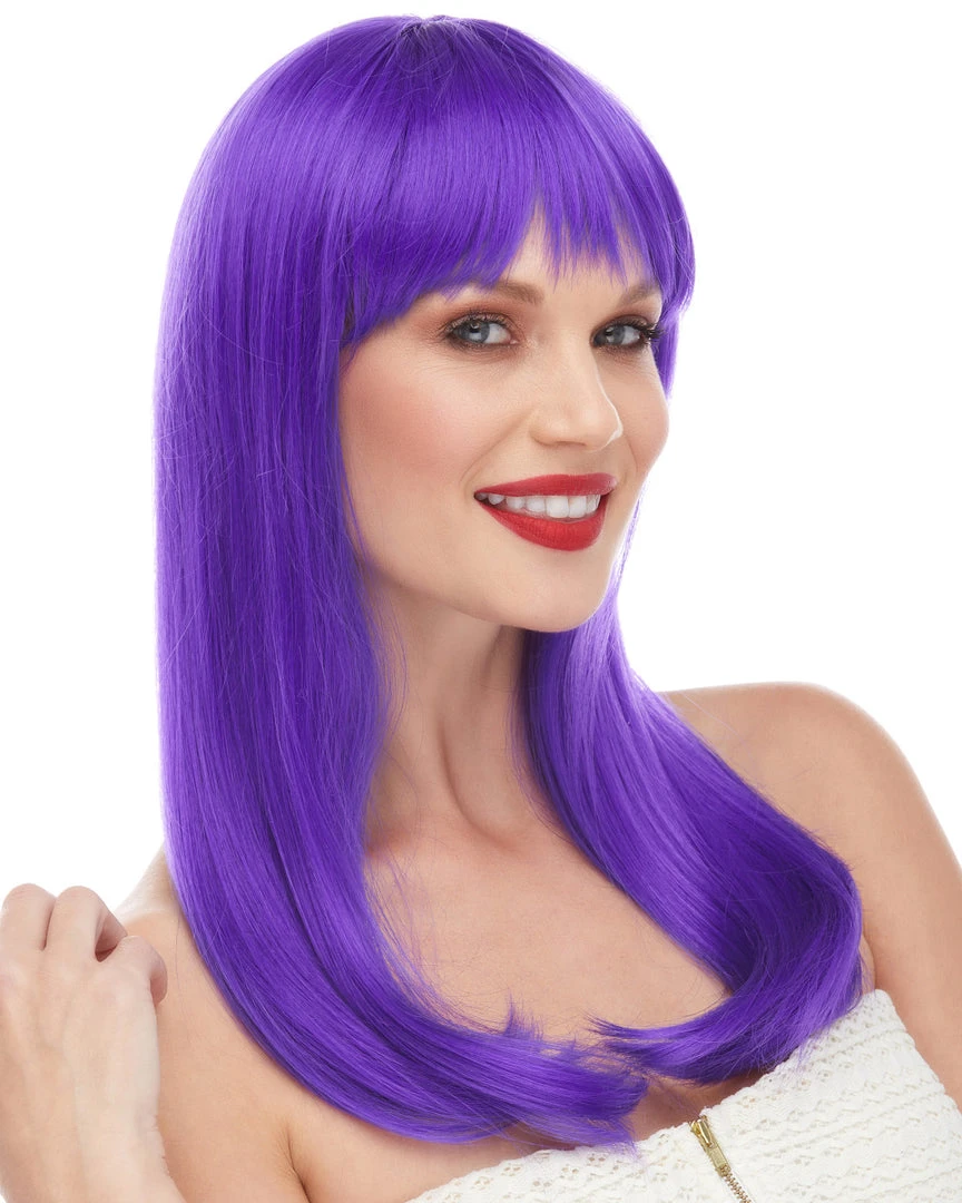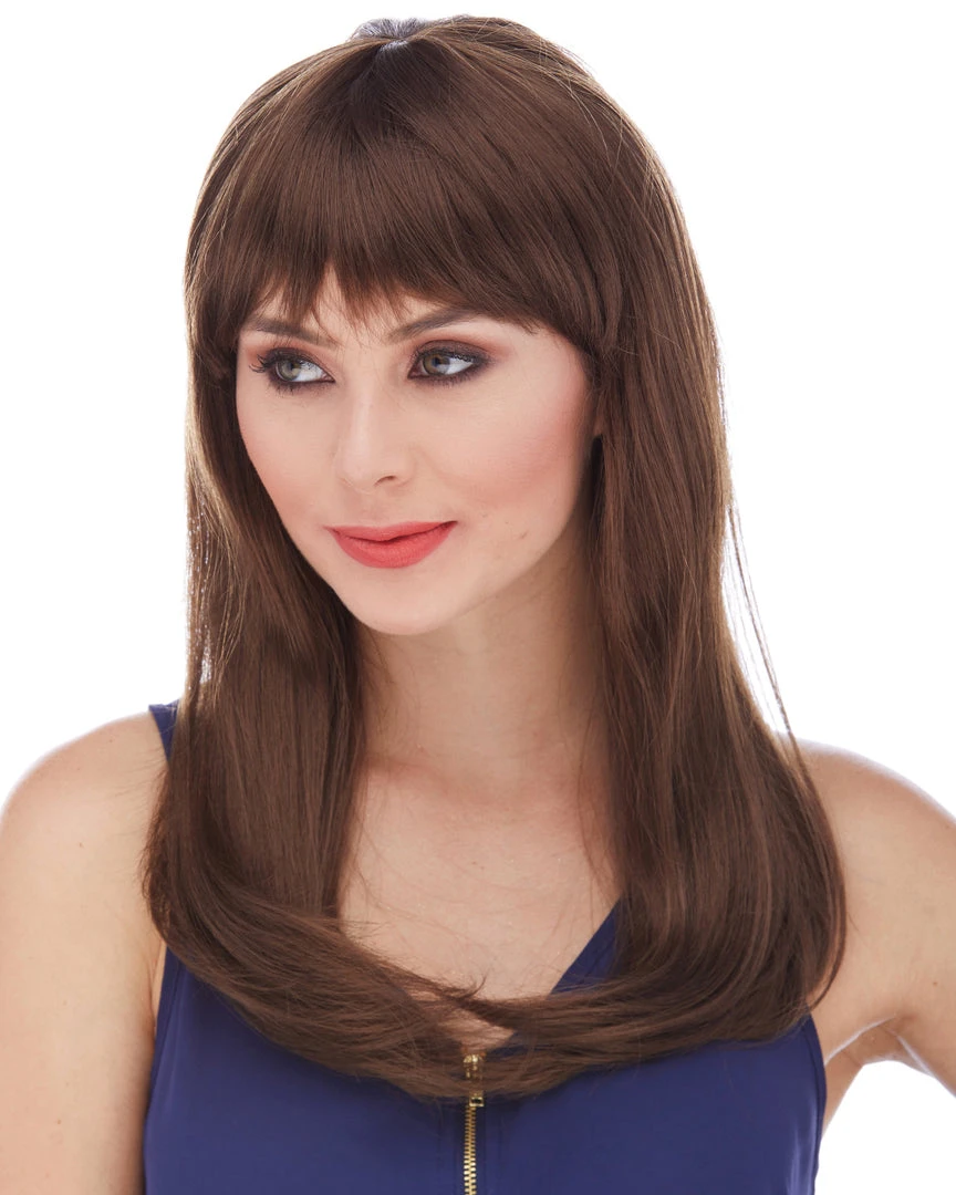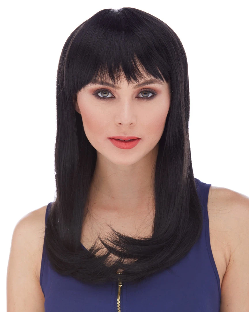 Sepia’s long straight wig with bangs in style Classy features long, sultry straight hair with rich bangs. Glossy synthetic fibers. Adult size, salon quality synthetic wig with woven cap and adjustable loop at the back.