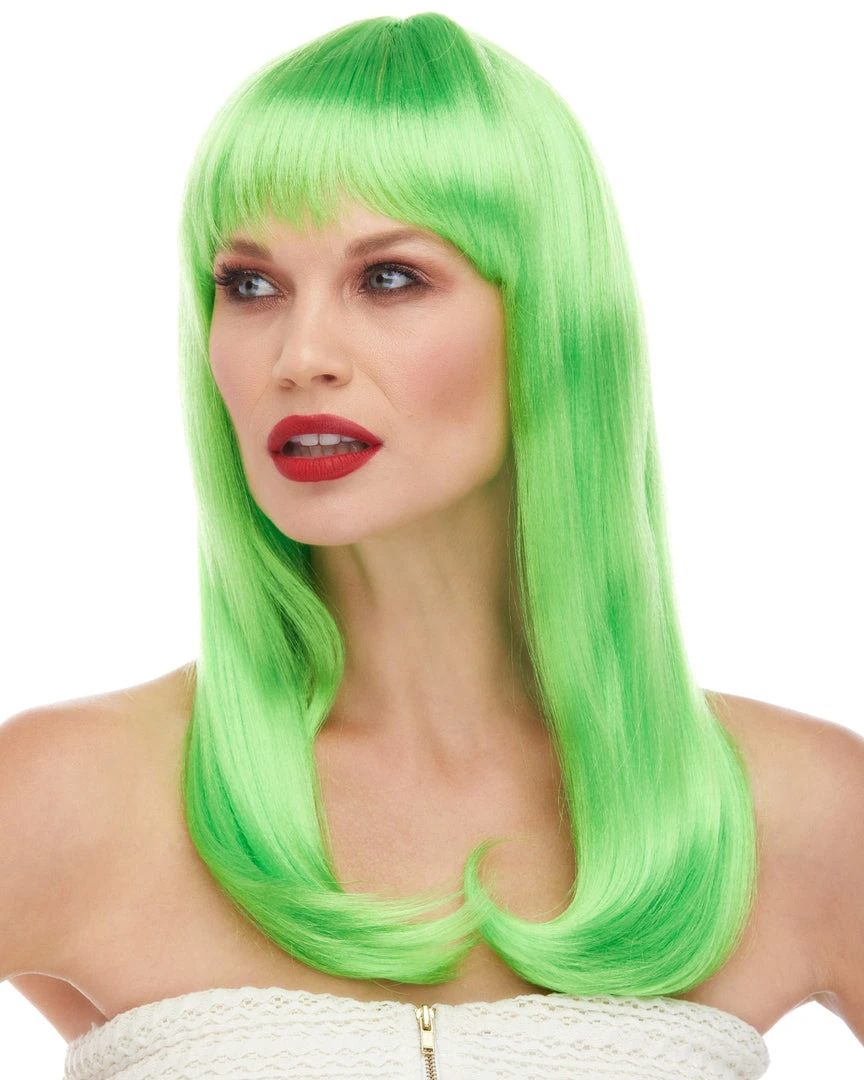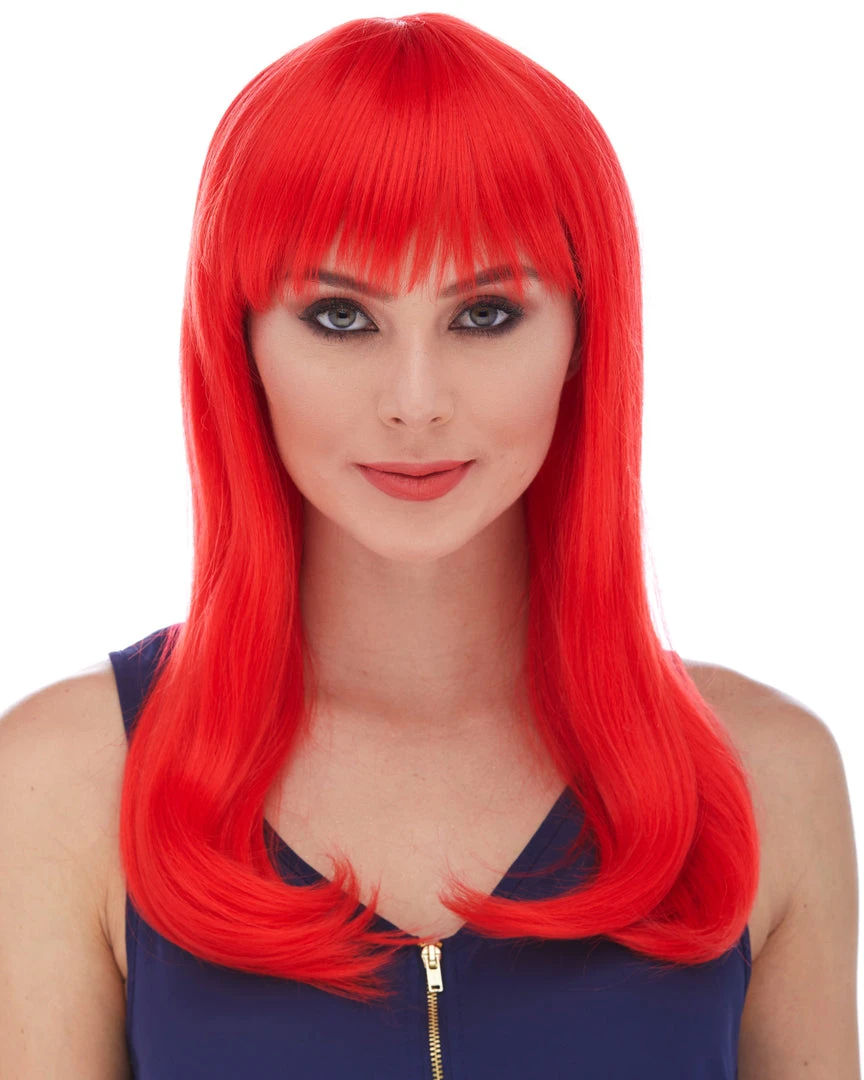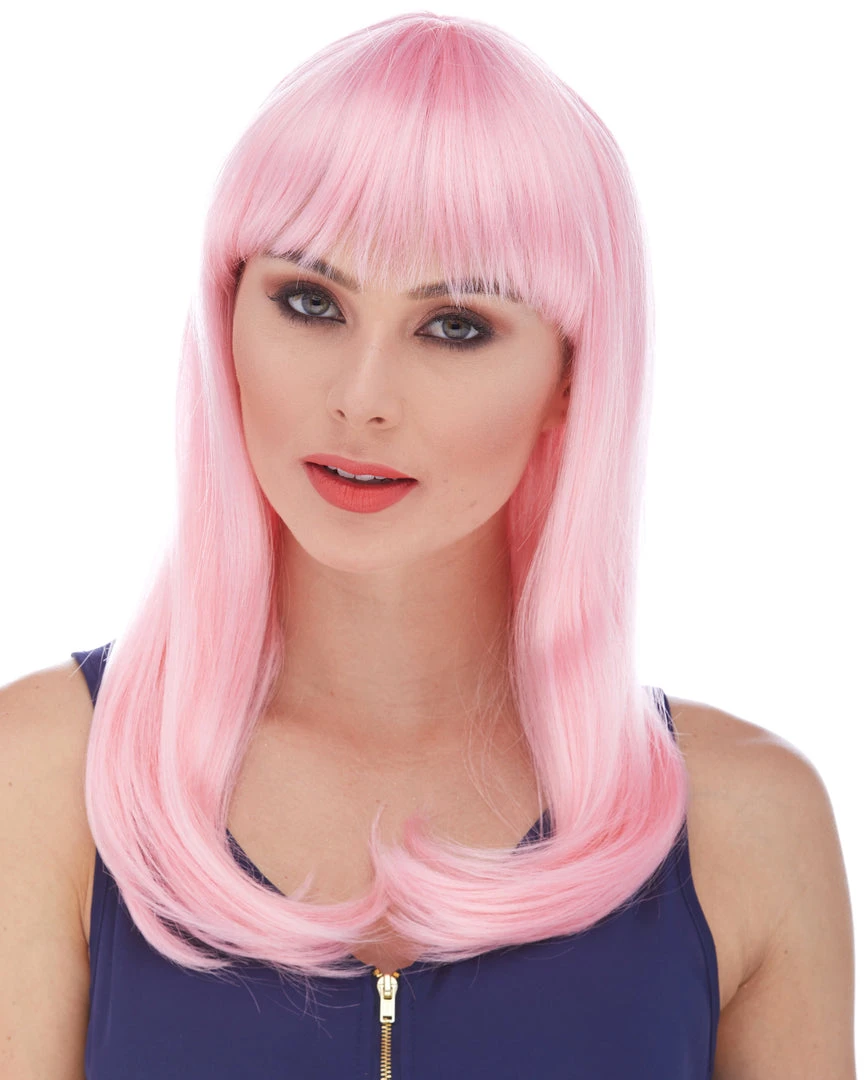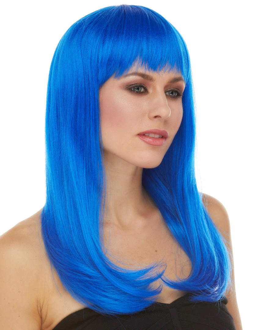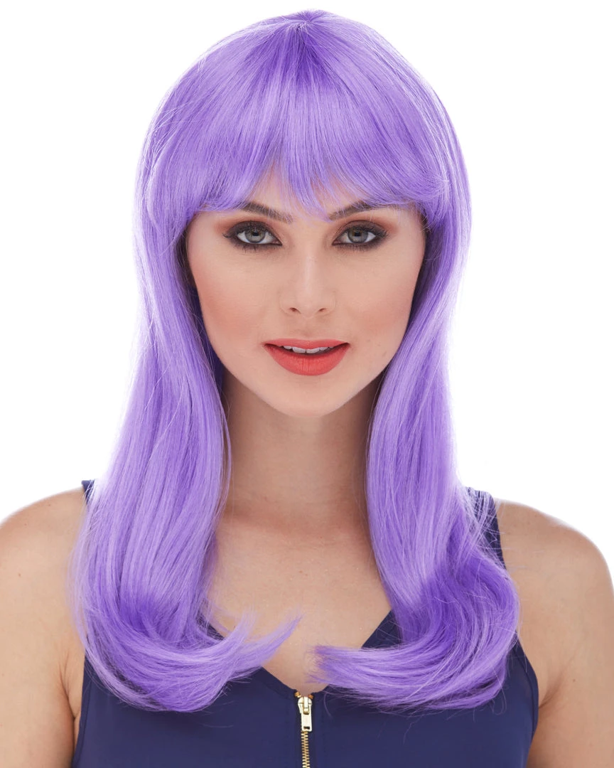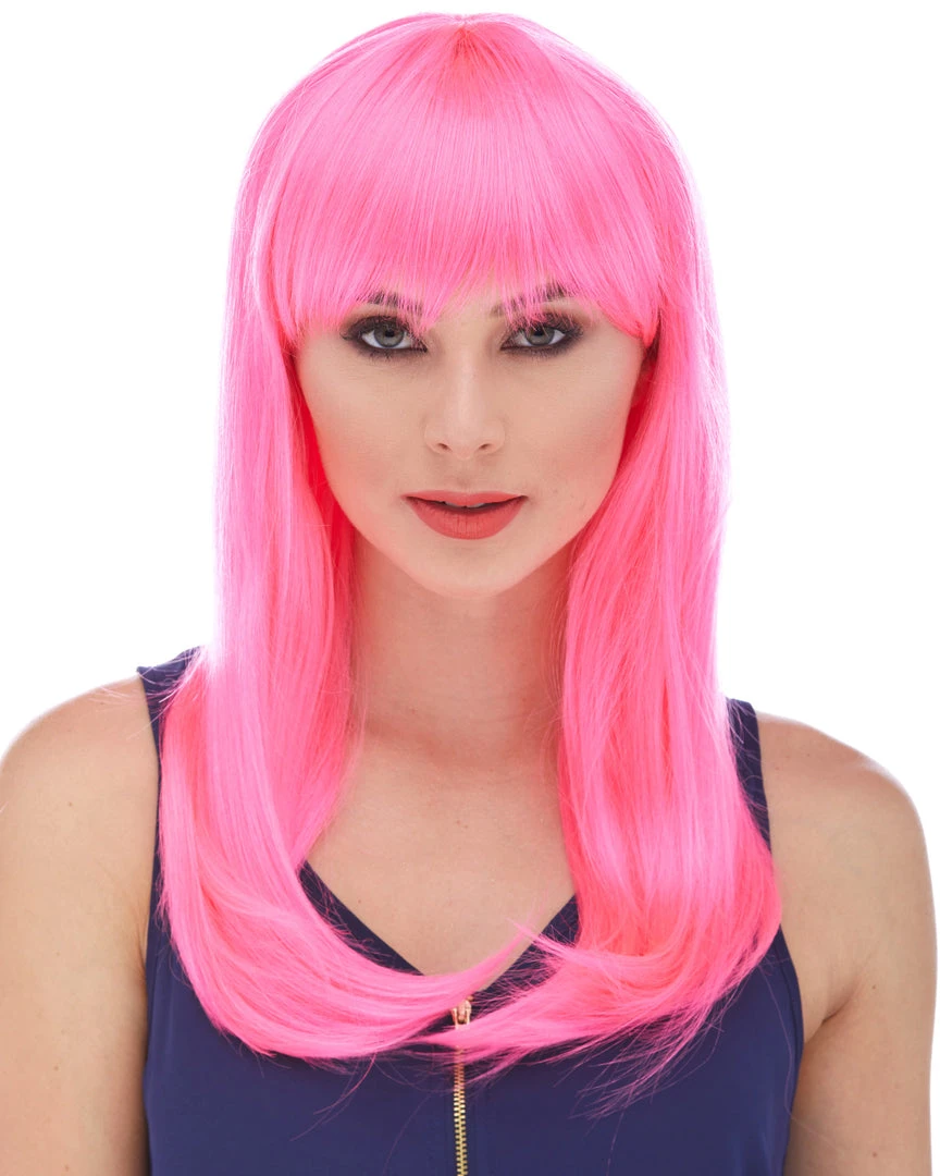 Sepia’s long straight wig with bangs in style Classy features long, sultry straight hair with rich bangs. Glossy synthetic fibers. Adult size, salon quality synthetic wig with woven cap and adjustable loop at the back.
