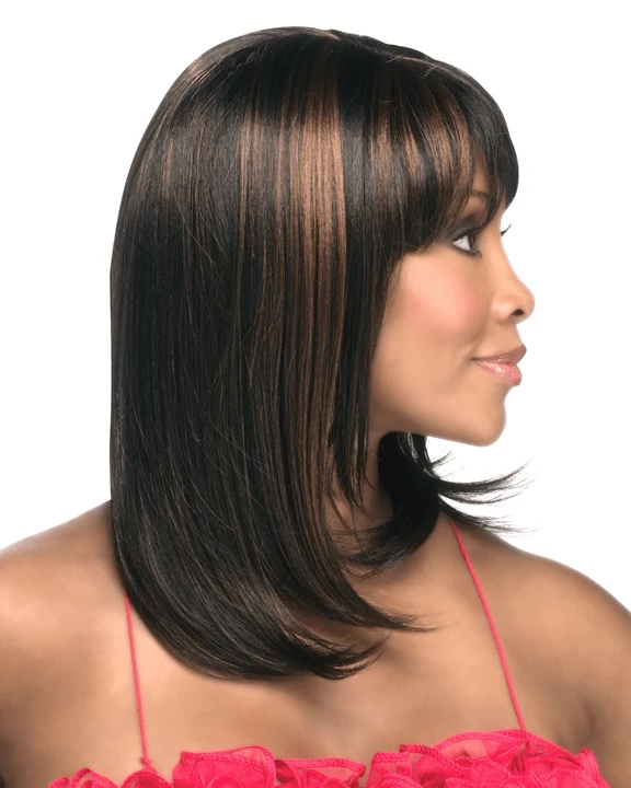Dawn V by Vivica Fox is a 15 inch straight silky wig with curved ends, center skin part, and bang. Pure stretch cap stretches throughout the entire perimeter which lets you wear it comfortably all day long without causing unwanted headache. Curved ends contours along your facial line to show your beautiful face.Â