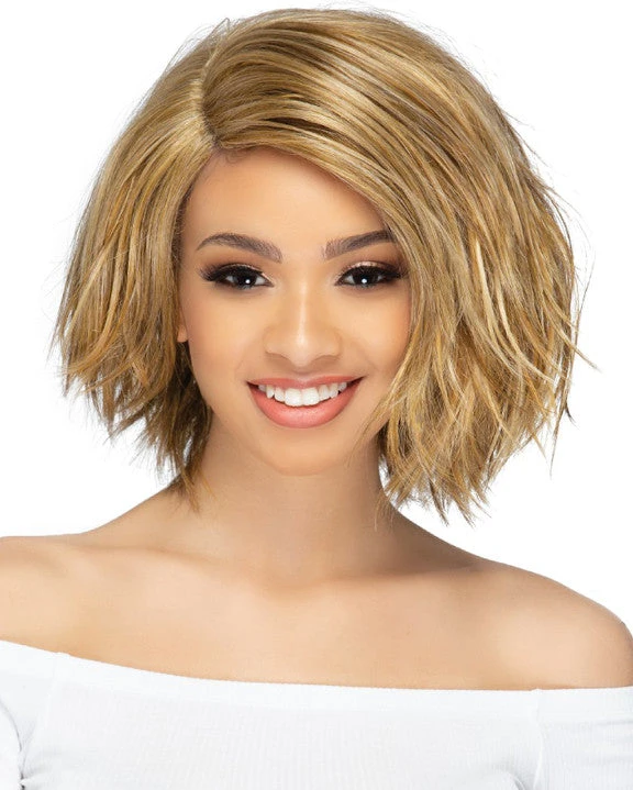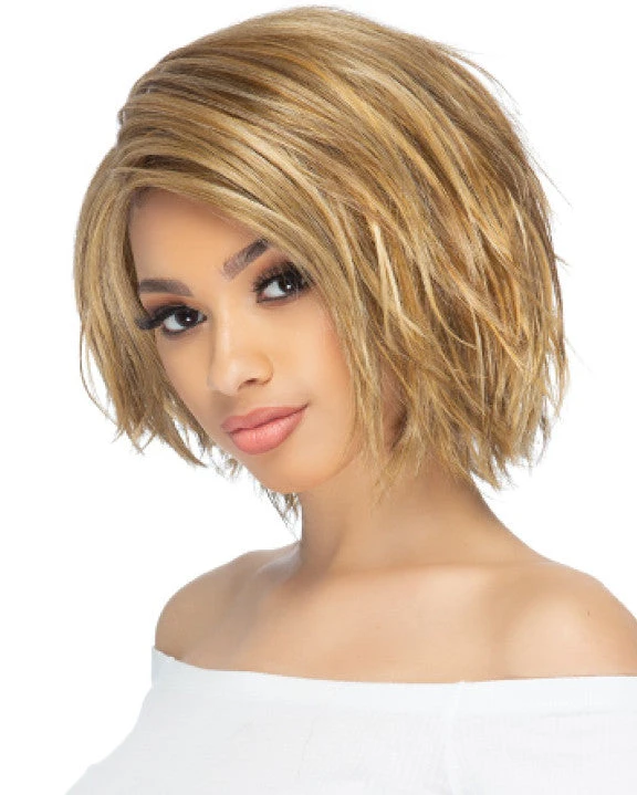 Emmett by Vivica Fox is an 11 inch tousled pixie cut with invisible side part.