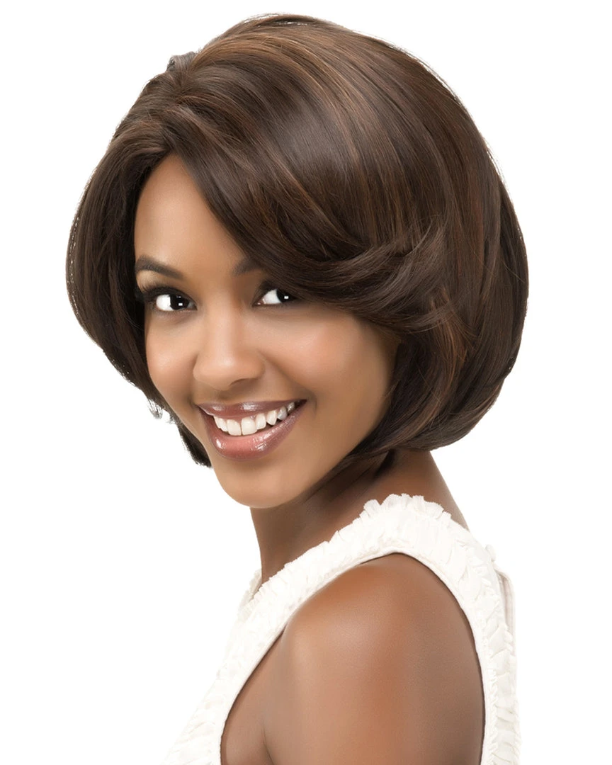 Mate by Vivica Fox is an 11 inch slanted, layered bob style with an off centered skin part. Pure stretch cap stretches throughout the entire inside perimeter which lets you wear it comfortably all day long without causing a surplus of difficulty. Its high heat resistant fiber not only curls well, but also keeps the curls made in place longer. This style is ageless and can be worn all year long. Keep others guessing and switch up your style to the class, well-put together look.