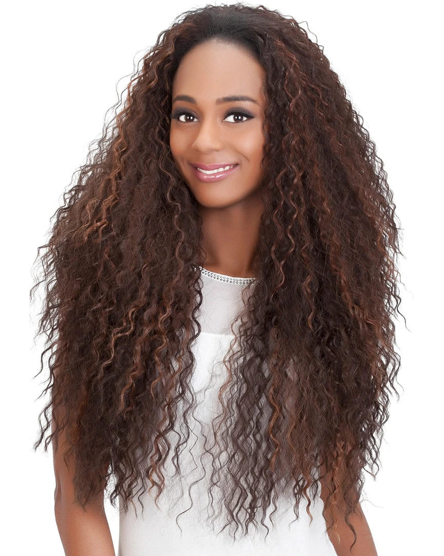 Paki by Vivica Fox is a 28 inch 3/4 express wig with layered loose water waves. Vivica’s 3/4 express wig has secure combs inside of the cap in the front and the back to prevent it from moving. The adjustable strap allows you to control the comfort level. Its Kanekalon New Futura synthetic high heat resistant fiber not only holds curls well, but also retains the curl longer than usual to keep the hair looking beautiful. This one piece is quick to install by blending your own hair, you’ll be out of the door in no time.