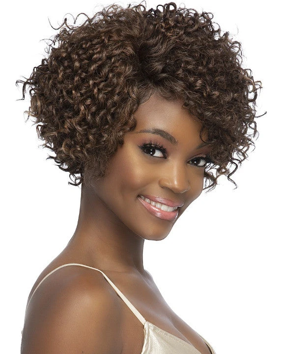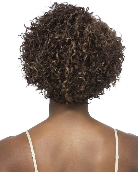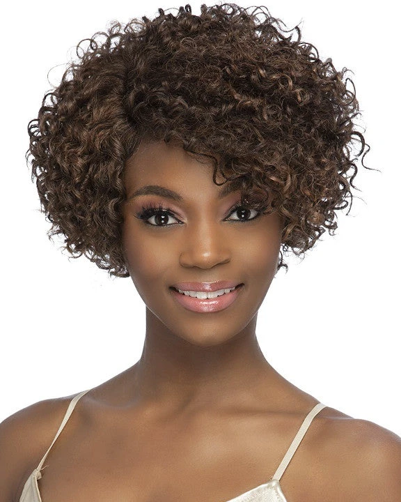 Philis by Vivica Fox is an short layered pieced spiral curl with invisible side part. Age look full of volume and curls.