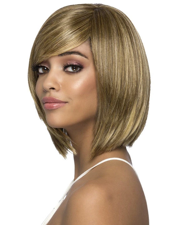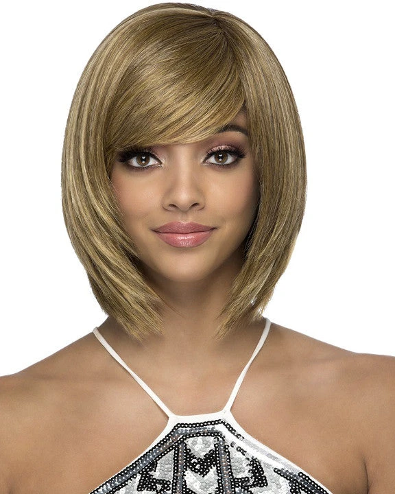 Secret by Vivica Fox is an 11 inch layered ends. Bob style with swept fringe bang.