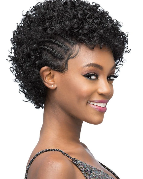 Beatrice by Vivica Fox is short tight rod set with invisible side cornrow braids. A young looking style.