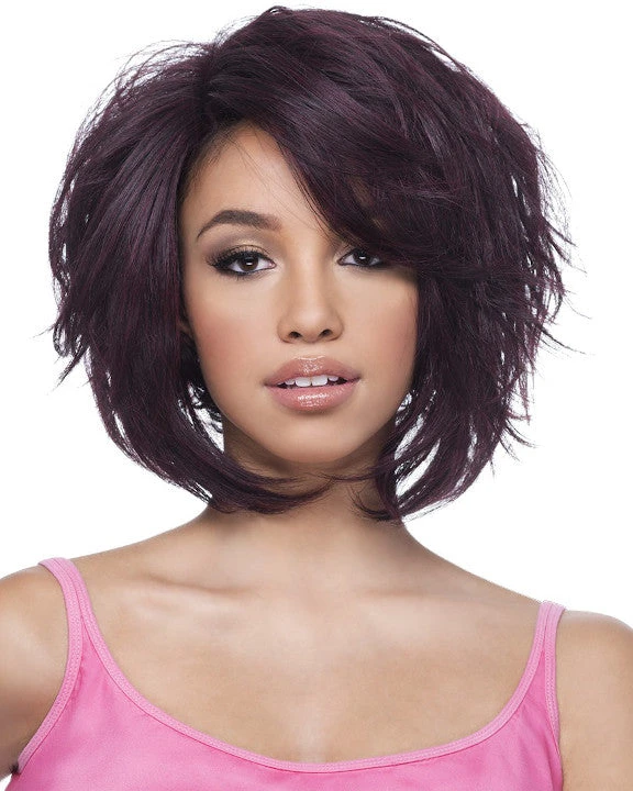V by Vivica Fox is an a 12 inch curly and straight combo angled cut with side invisible part. Its high heat resistant fiber not only curls well, but also keeps the curl longer to keep the hair look beautiful. It is featured with lace front that has 100 percent hand-stitched natural baby hair with swiss lace front which will enhance the natural look of yours when you wear the wig. She is one of Vivica’s best-selling styles, and this look never goes out of style!