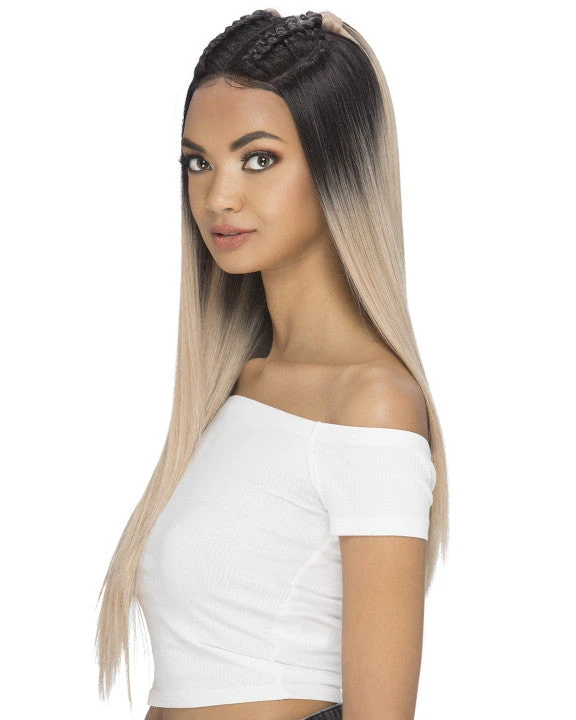 Raina by Vivica Fox is an 29″ layered straight style with 2 braids on top & an invisible omega part. Trendy braid style.